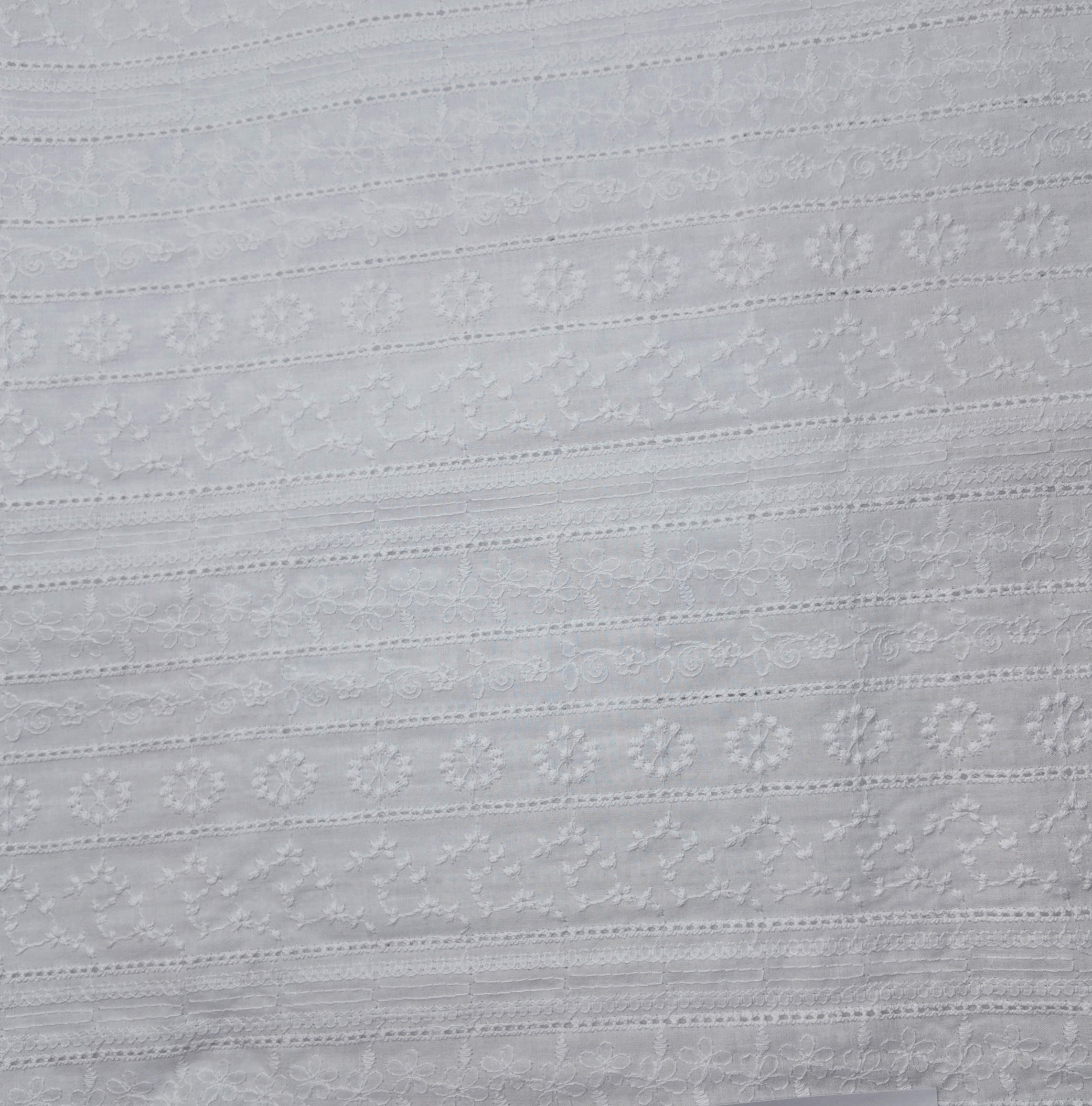 lignes brodées qui se succèdent, parsemées de petites fleurs en relief dans un blanc délicatement texturé