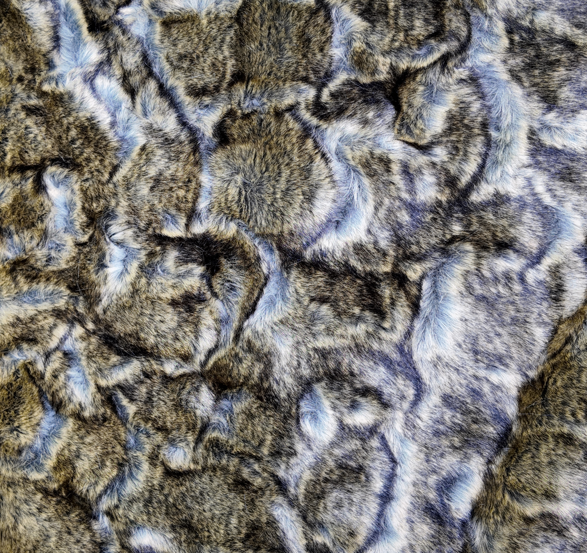 Tissu fausse fourrure à reflets bleutés et bruns, doux et luxueux au toucher.