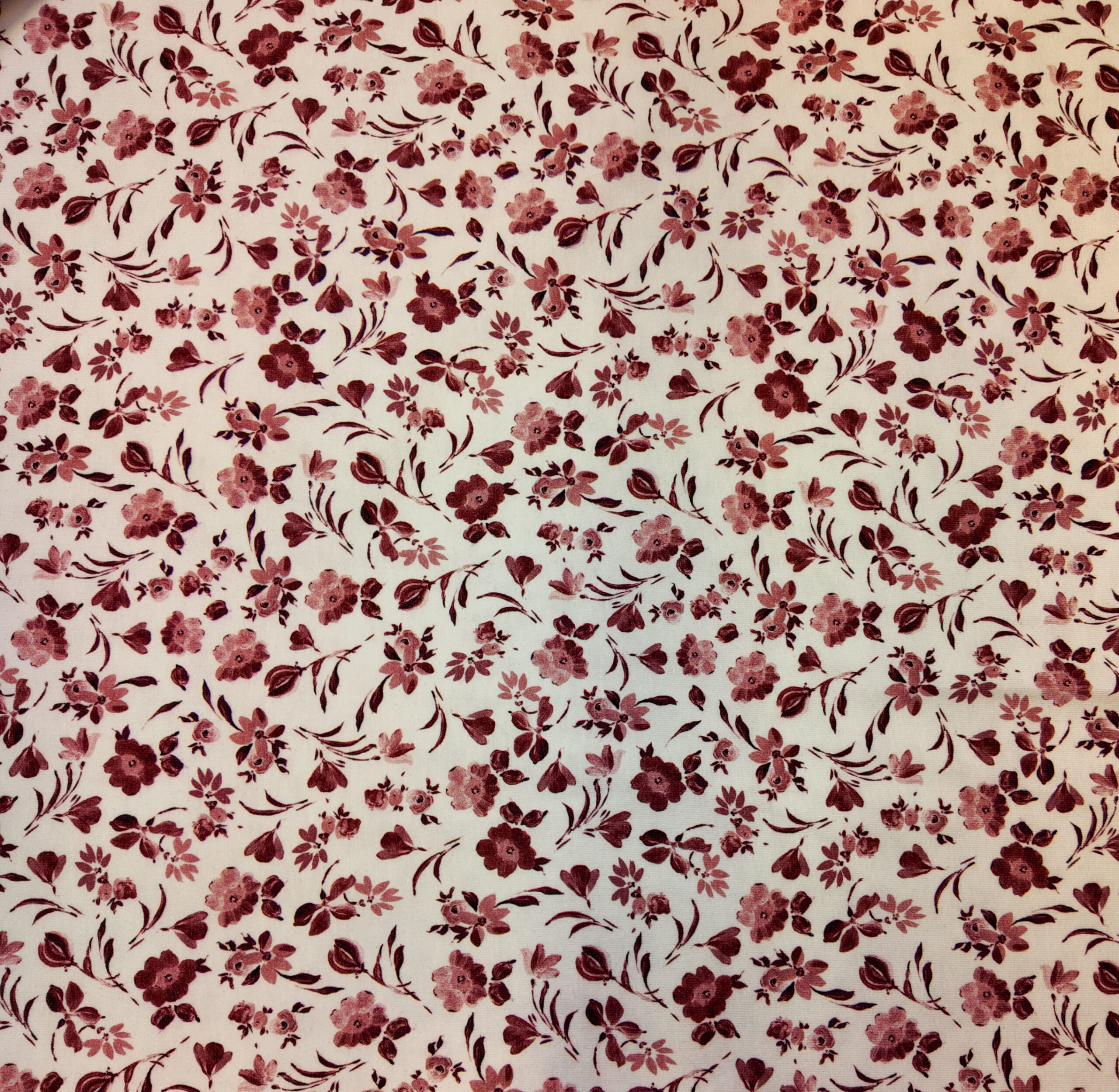 Tissu à fond beige clair animé de petites fleurs bordeaux aux lignes souples et délicates, inspirant douceur et romantisme intemporel.