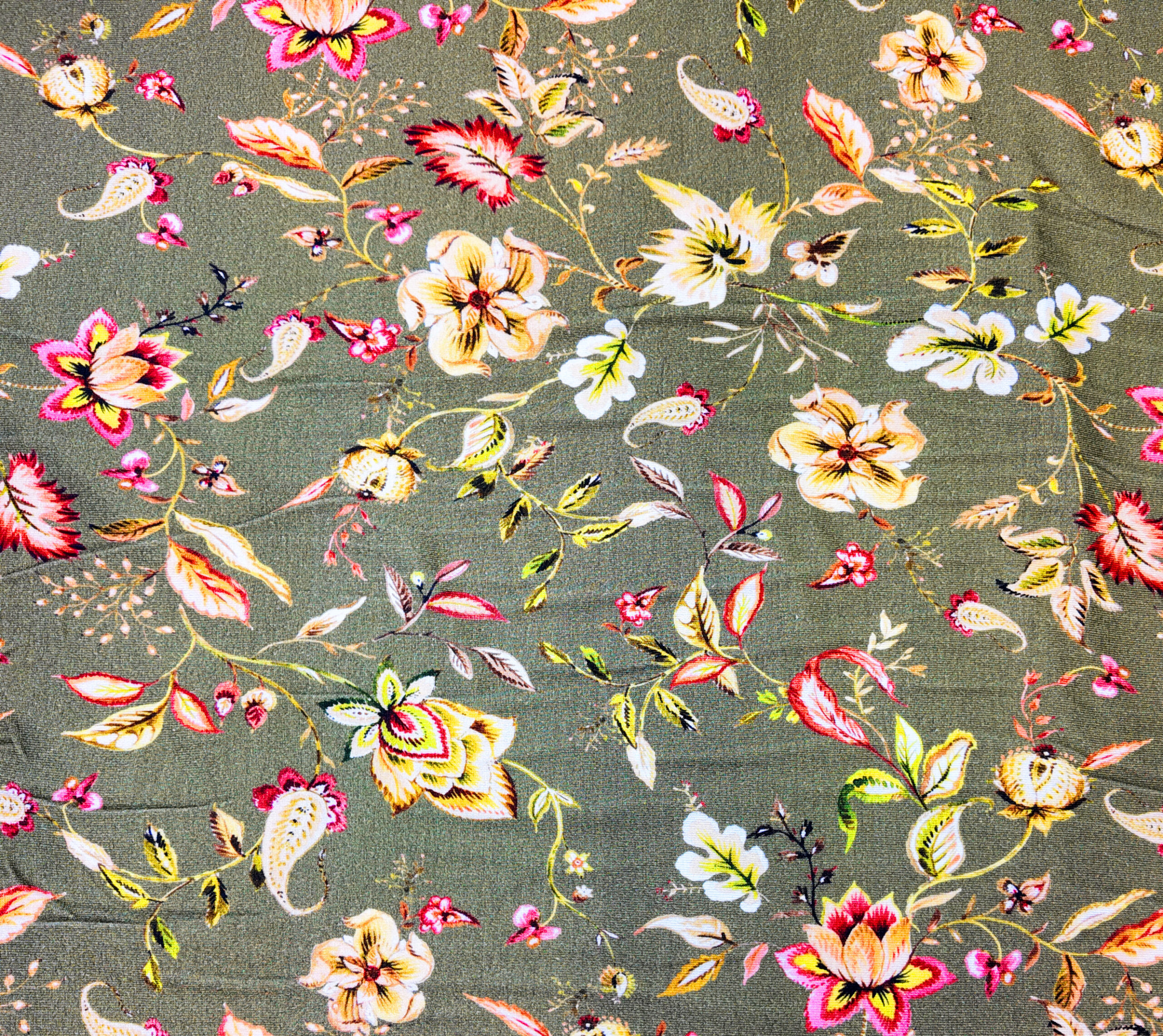 Fond kaki rehaussé de grandes fleurs multicolores aux teintes dorées, rosées et crème, évoquant une élégance bohème et naturelle.