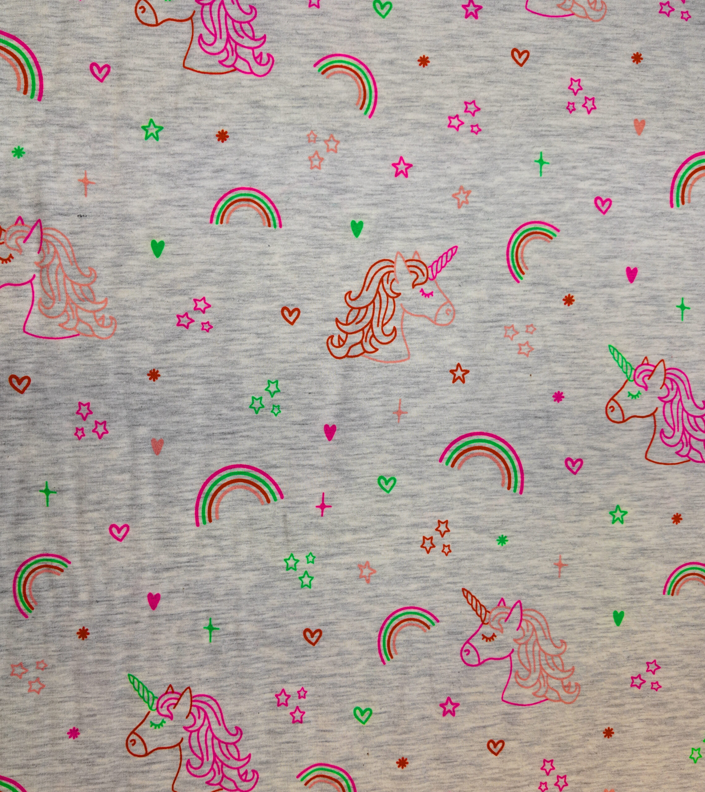 Fond gris clair orné de licornes colorées, arcs-en-ciel et étoiles, un rêve féerique plein de douceur.