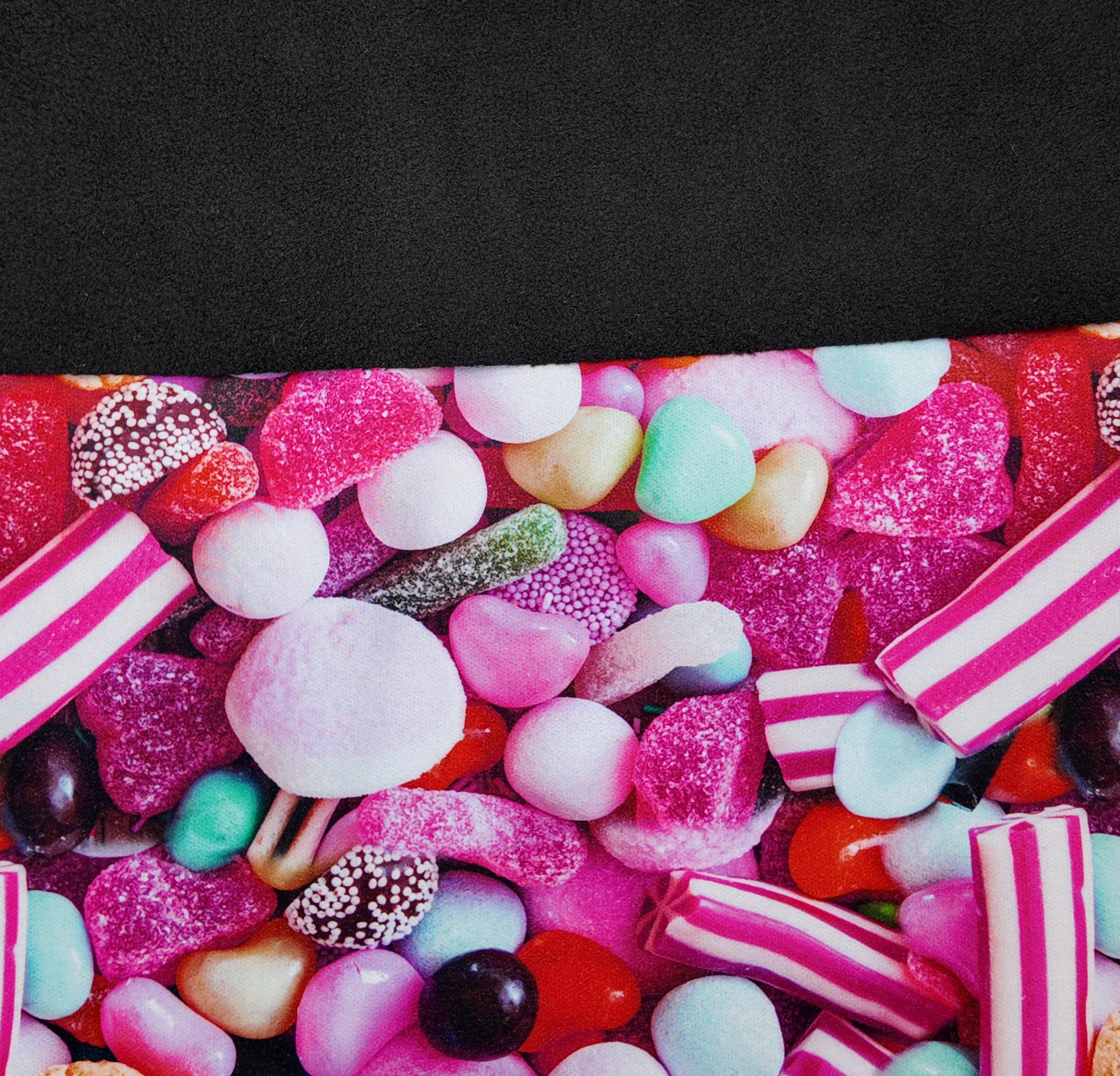 Tissu imperméable à double face, alliant un revers polaire noir à un recto éclatant orné de bonbons colorés. Un mariage audacieux de fantaisie et de technicité pour un style unique et joyeux.