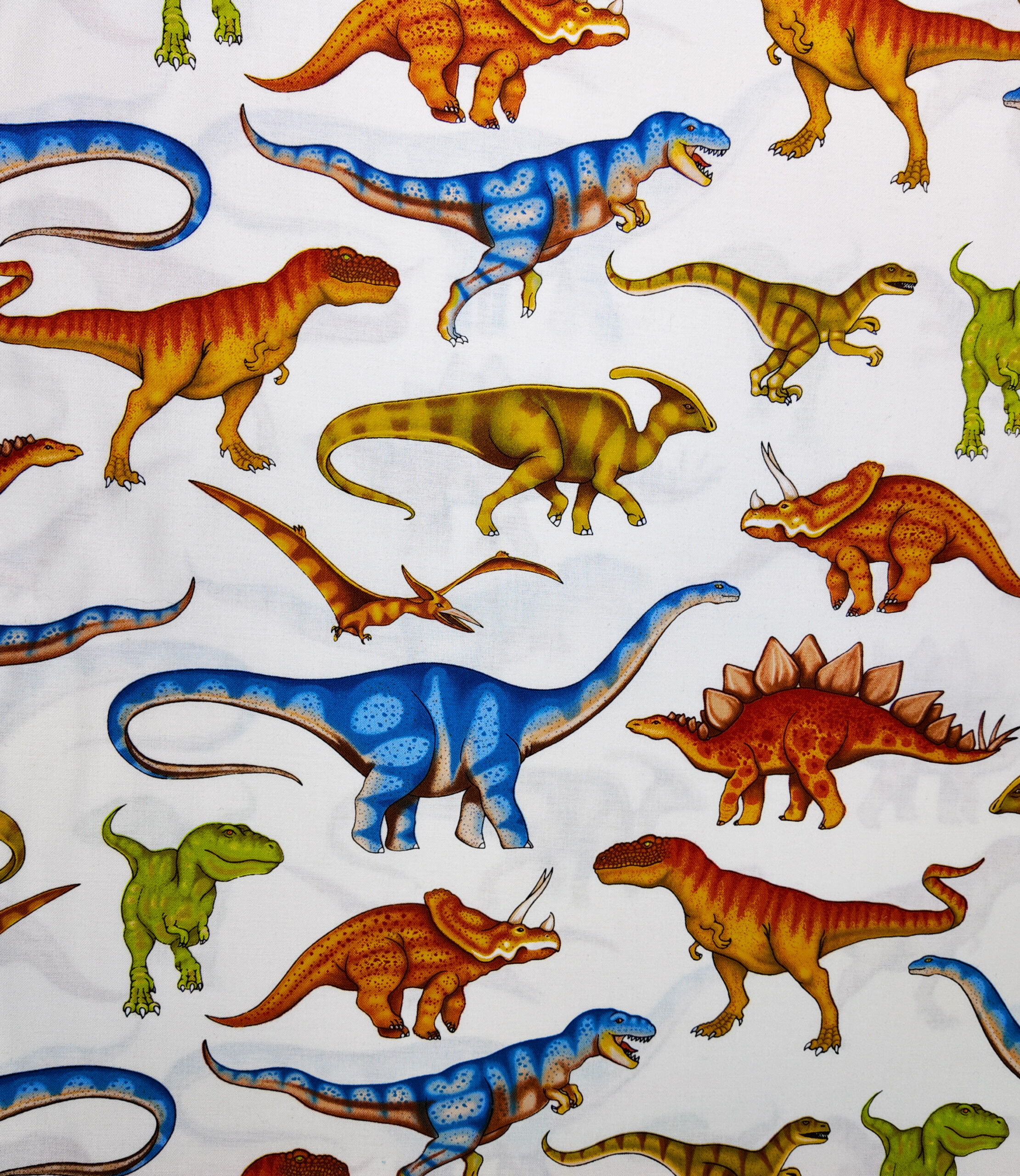 Sur un fond clair, d’impressionnants dinosaures aux teintes vives se déploient dans toute leur majesté. Ce tissu transporte au cœur d’un monde préhistorique vibrant et ludique.