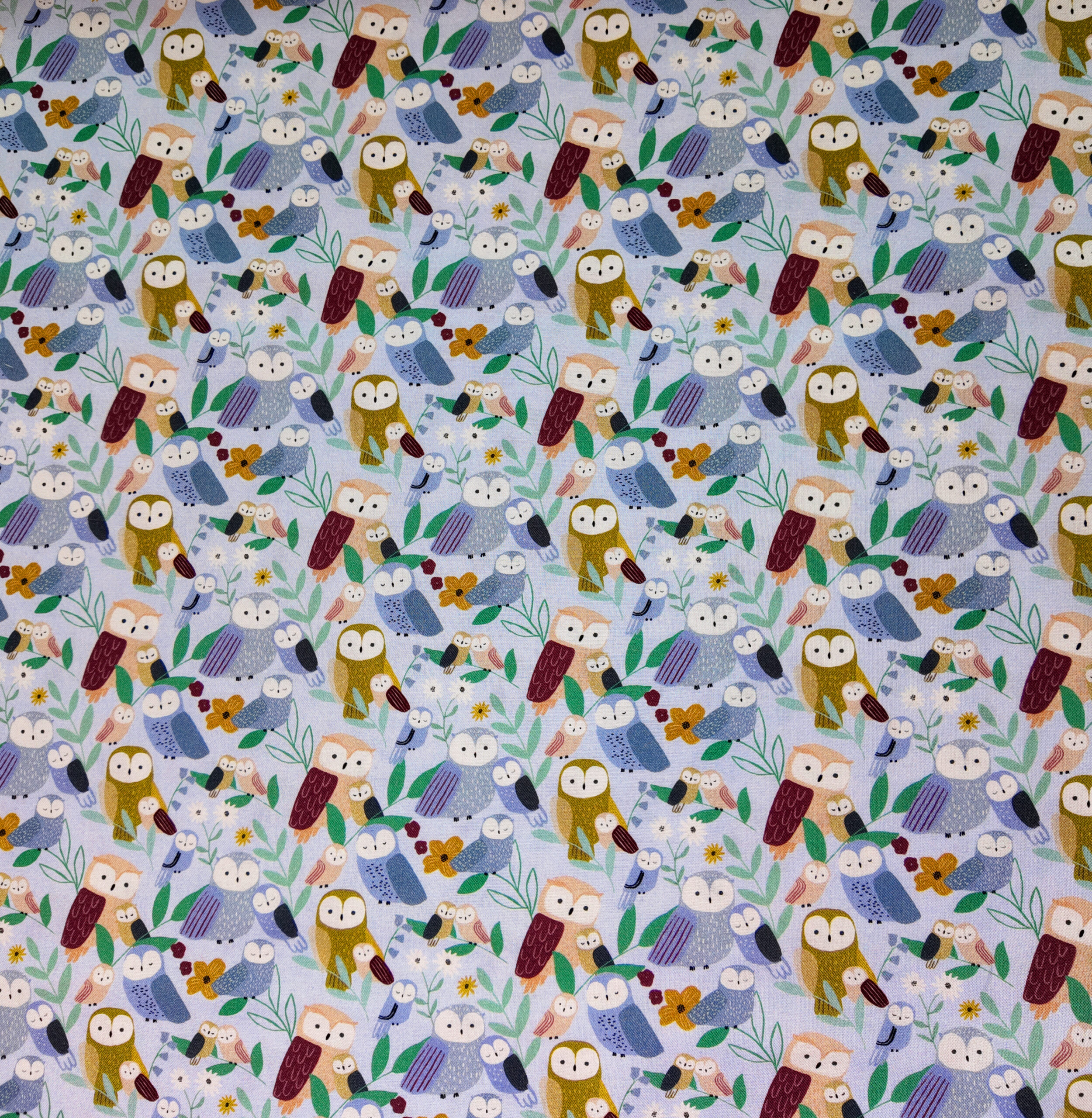 Une nuée de chouettes et hiboux colorés s’anime sur un fond bleu pâle. Ce tissu diffuse une tendresse poétique, idéale pour un univers doux et rêveur.