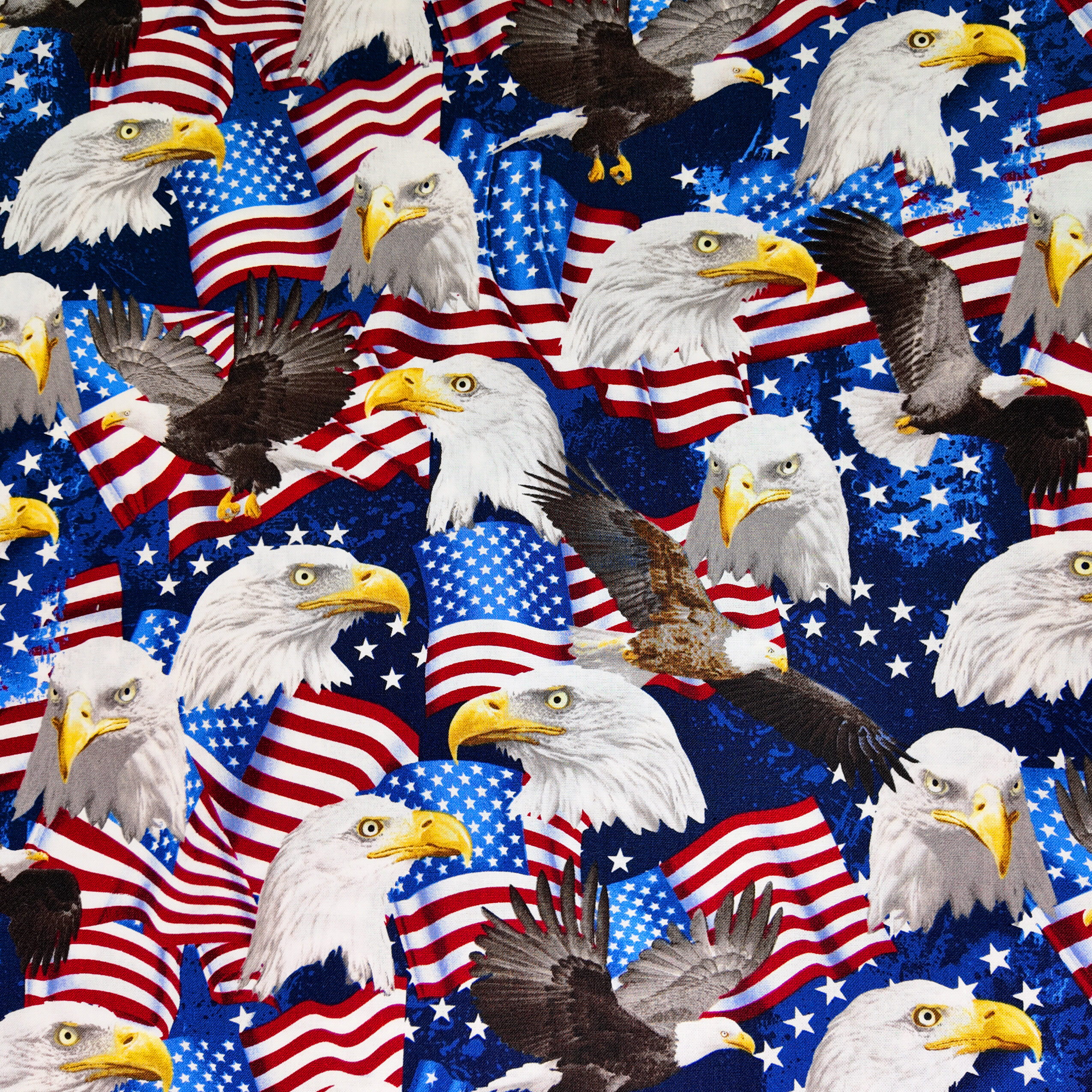 Aigles imposants et drapeaux étoilés se mêlent sur un ciel bleu profond. Ce tissu symbolise la liberté et la grandeur, dans une énergie audacieuse.
