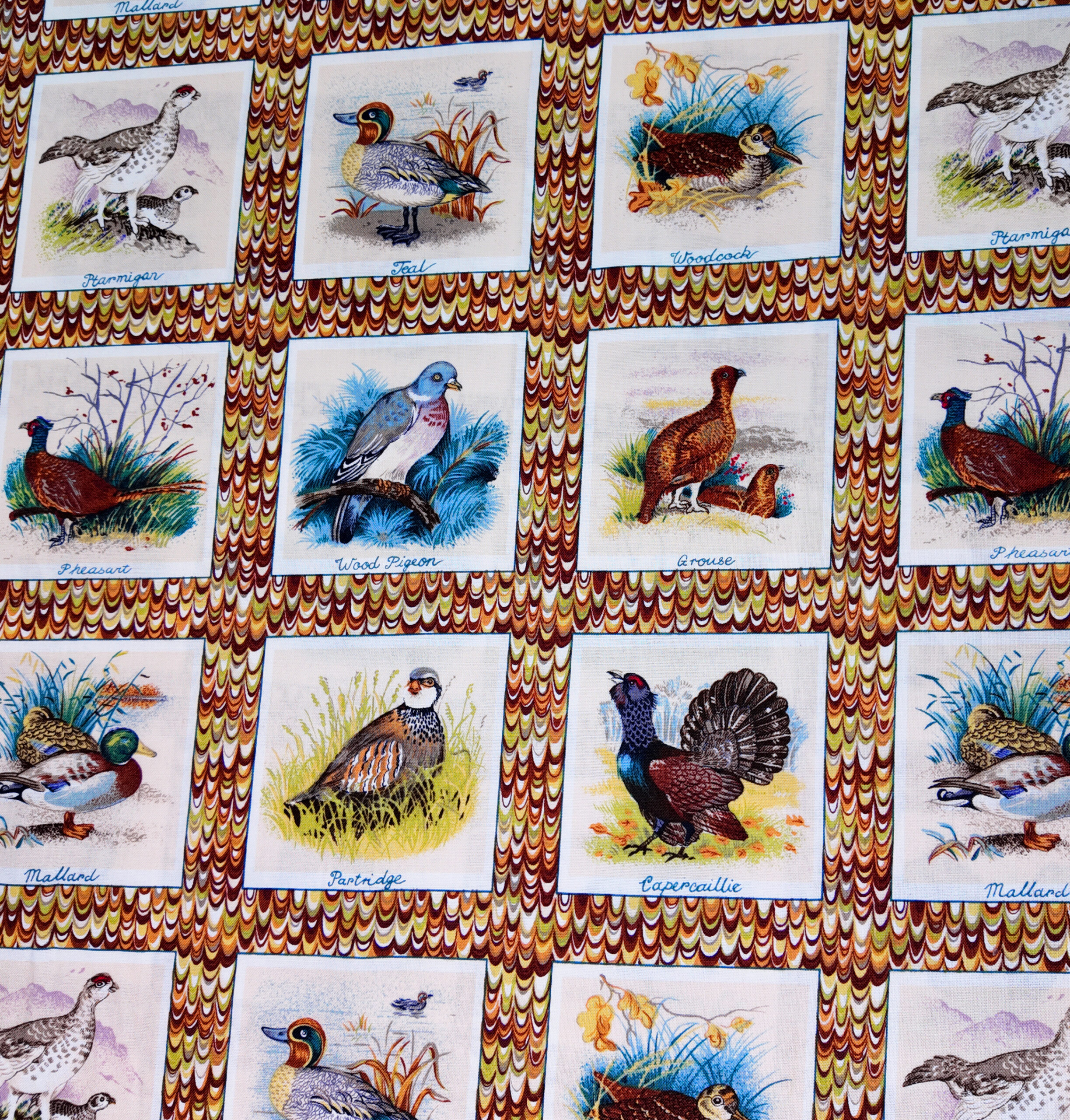 Une galerie d’oiseaux illustrés dans des cadres délicats, sur fond de plumes aux tons chauds. Ce tissu rappelle les planches anciennes d’ornithologie.