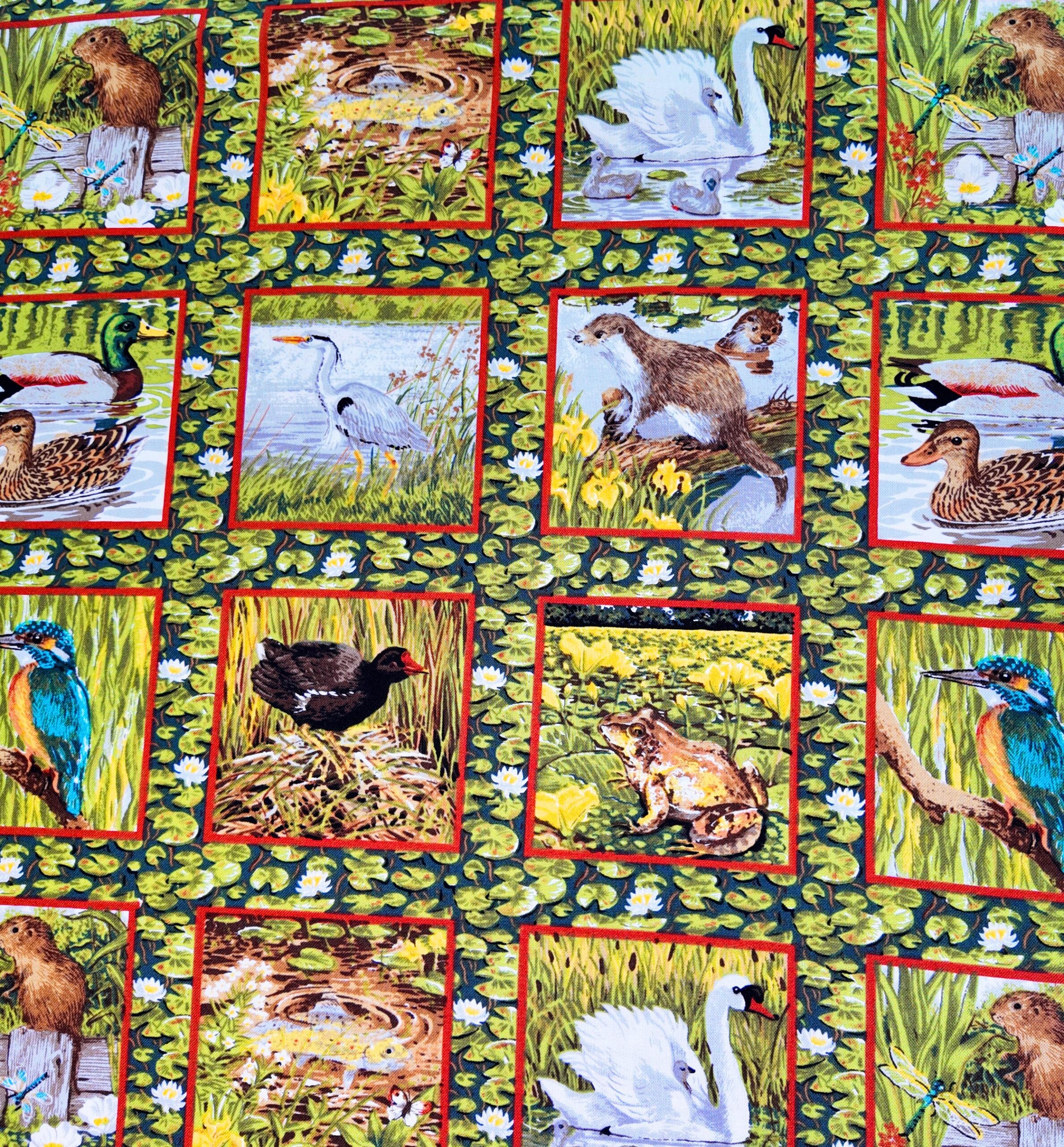 Scènes de marais et d’étangs peuplés de cygnes, canards et loutres encadrées de nénuphars. Ce tissu raconte la vie tranquille des eaux calmes.