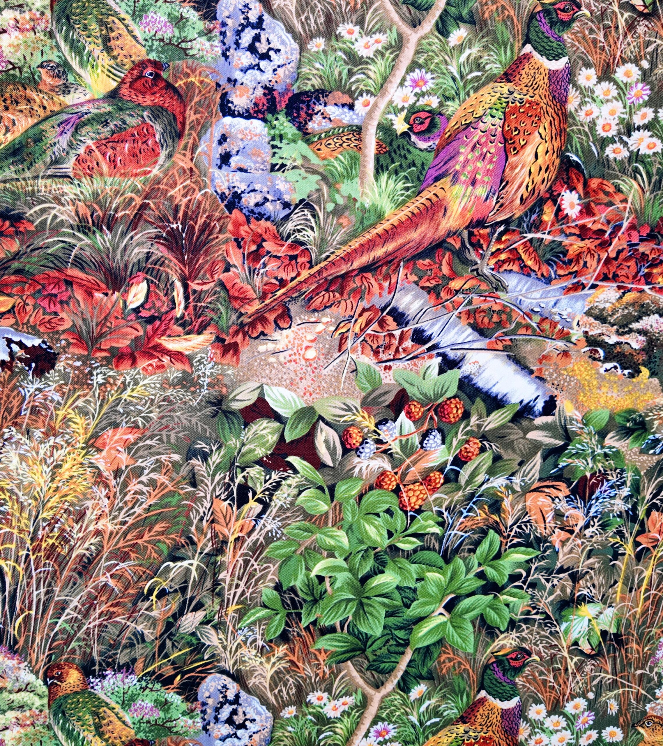 Faisans colorés se mêlent à une végétation luxuriante d’automne. Ce tissu regorge de chaleur, de vie et de détails chatoyants.
