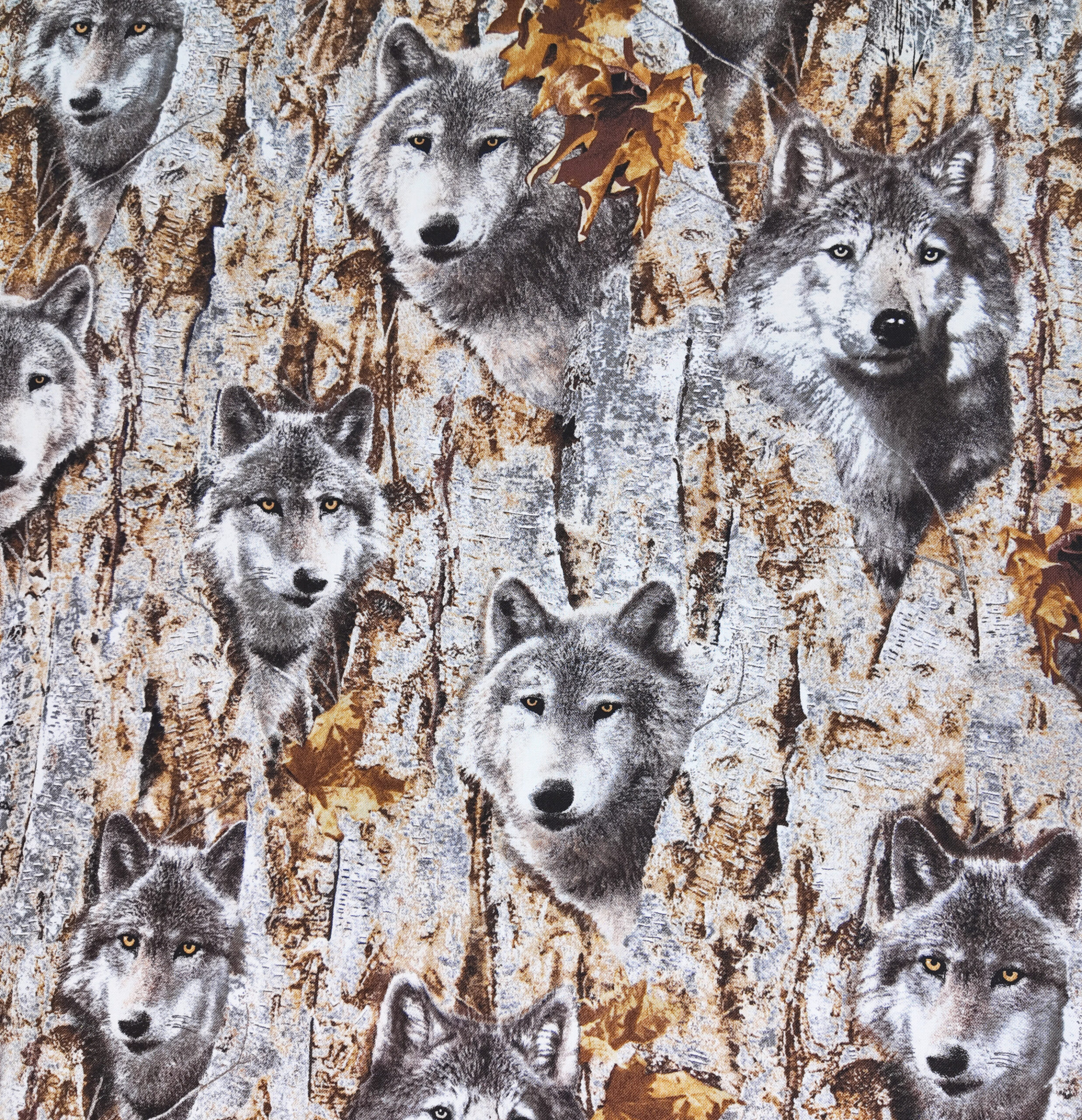 Loups aux regards perçants dissimulés dans l’écorce d’un bois doré. Ce tissu respire la puissance et la majesté de la nature sauvage.