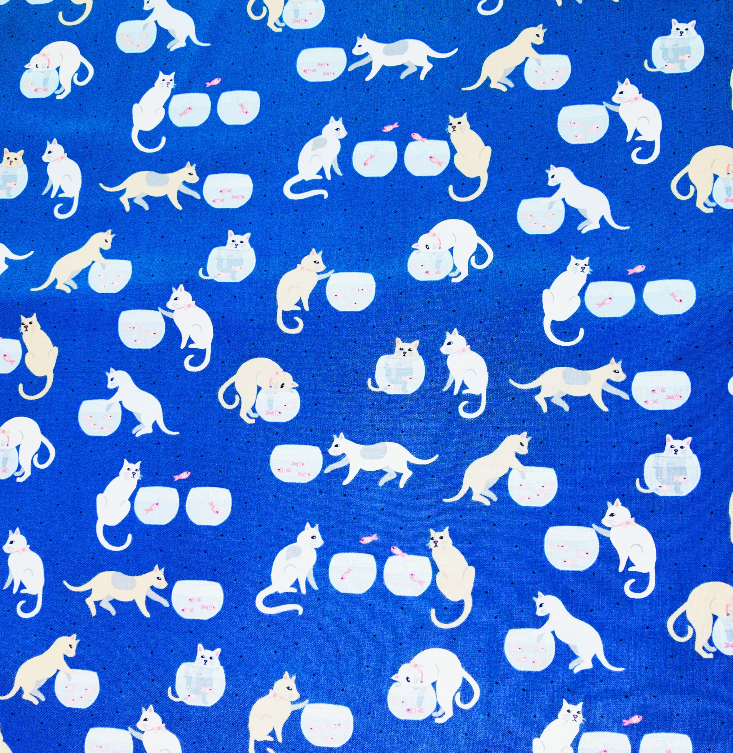 Chats clairs jouant avec des poissons rouges dans leurs bocaux sur un fond bleu profond. Un univers à la fois drôle et paisible.