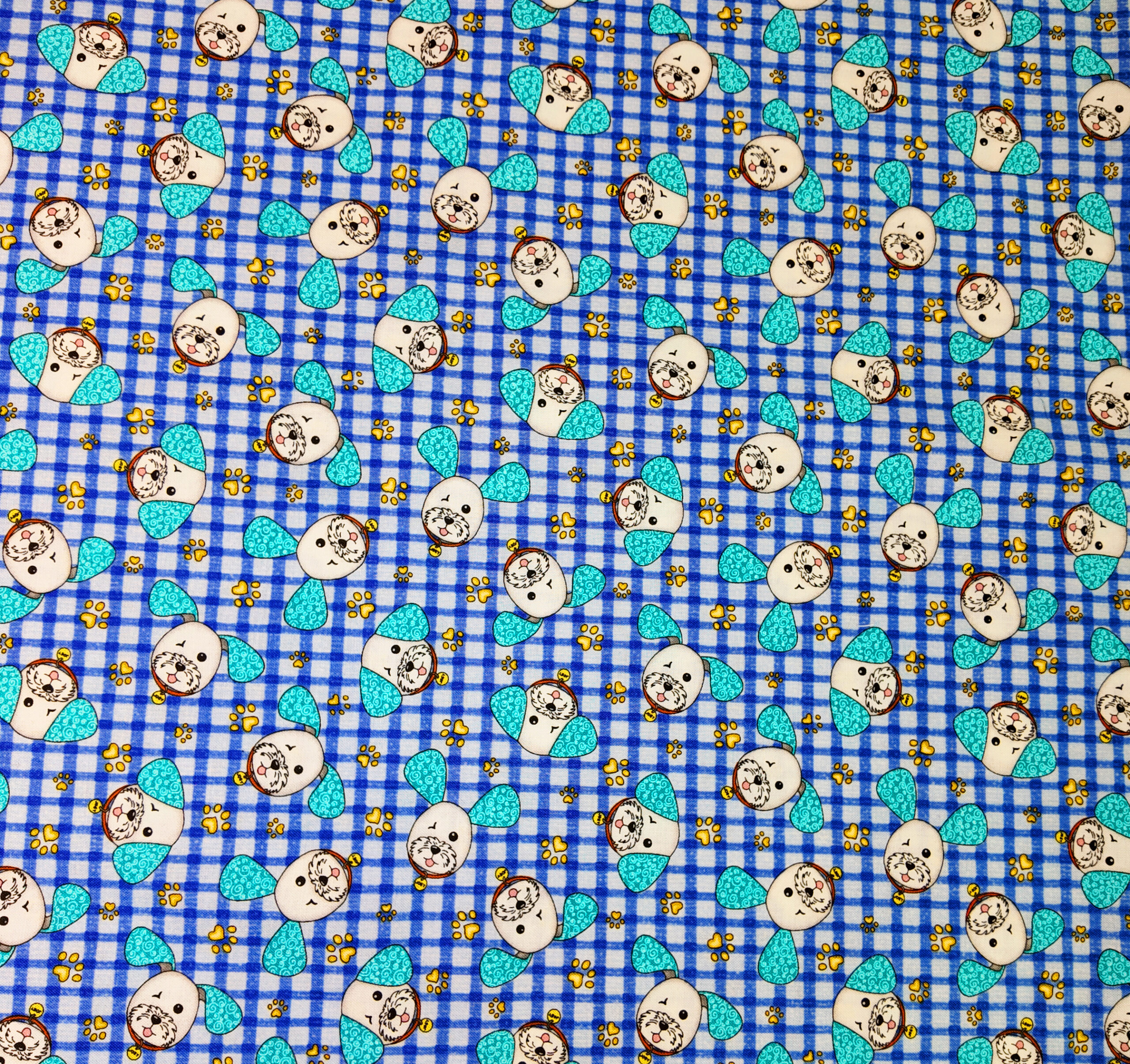 Un motif gai et enfantin de têtes de chiens stylisées sur fond à carreaux bleus, ponctué de fleurs jaunes. Un tissu joyeux et lumineux.