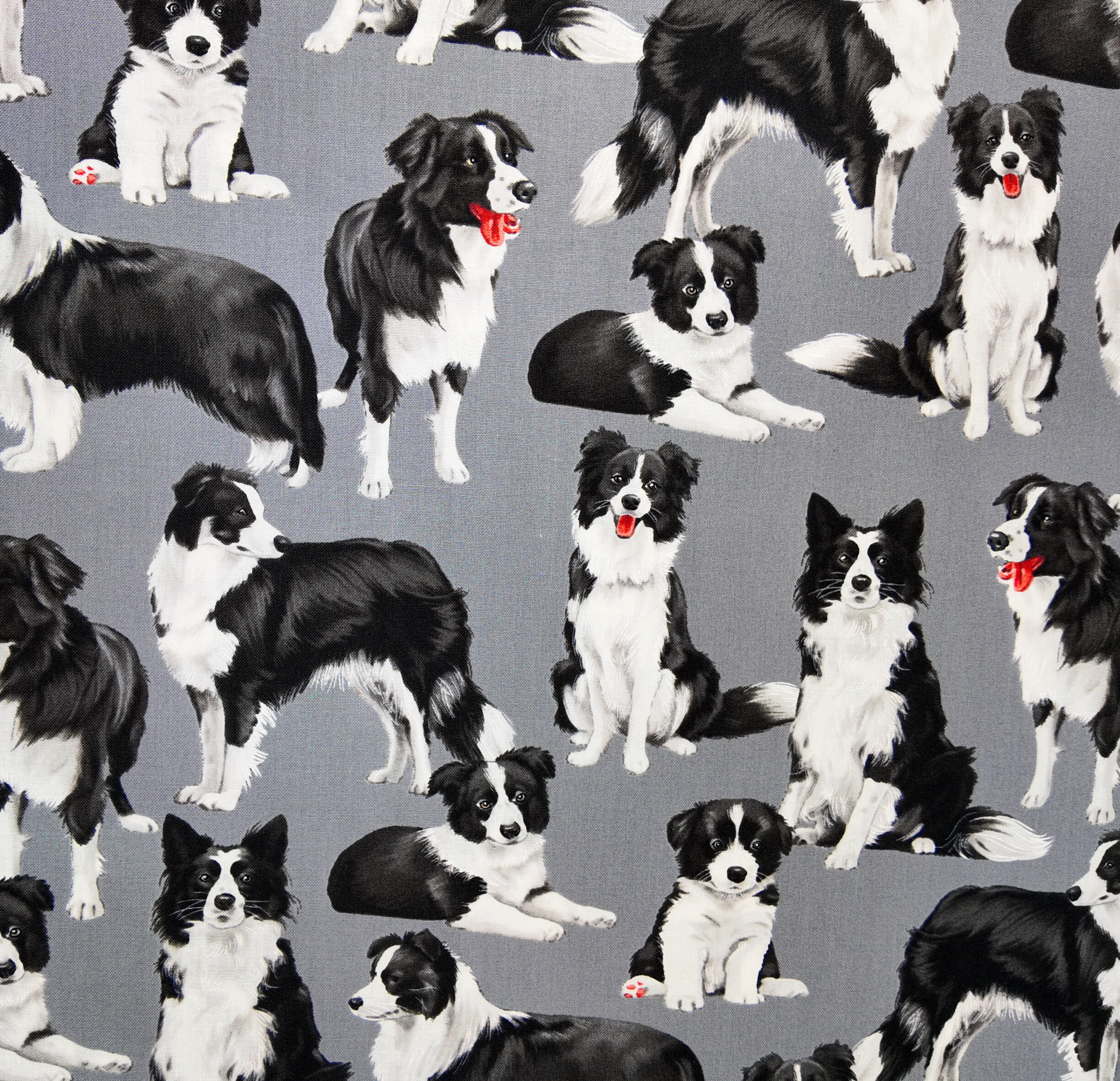 Élégants border collies noirs et blancs se détachent sur fond gris perle. Leurs postures attentives et pleines de douceur évoquent la fidélité et la sérénité.