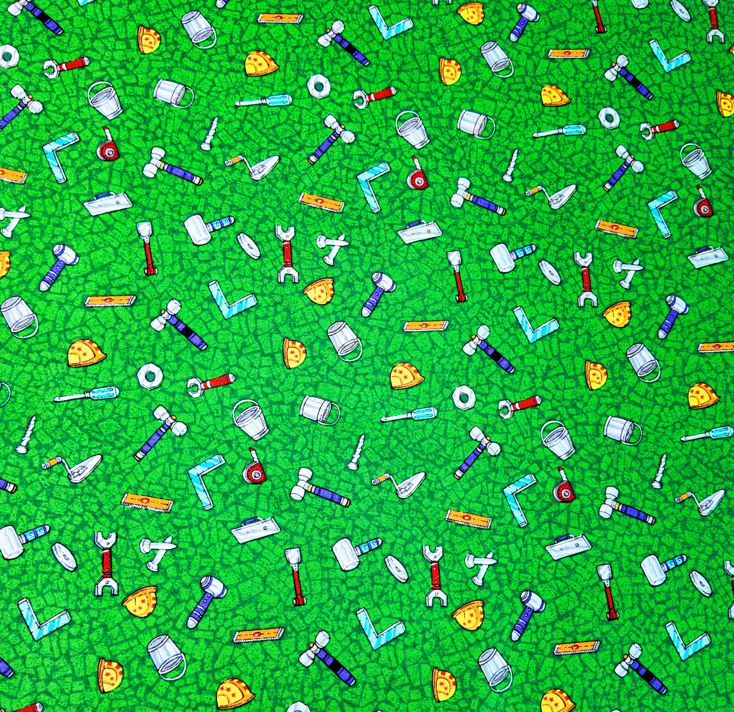 Sur un fond vert éclatant, une multitude d’outils miniatures se déploie avec fantaisie : marteaux, clés, seaux et casques racontent le monde du chantier.