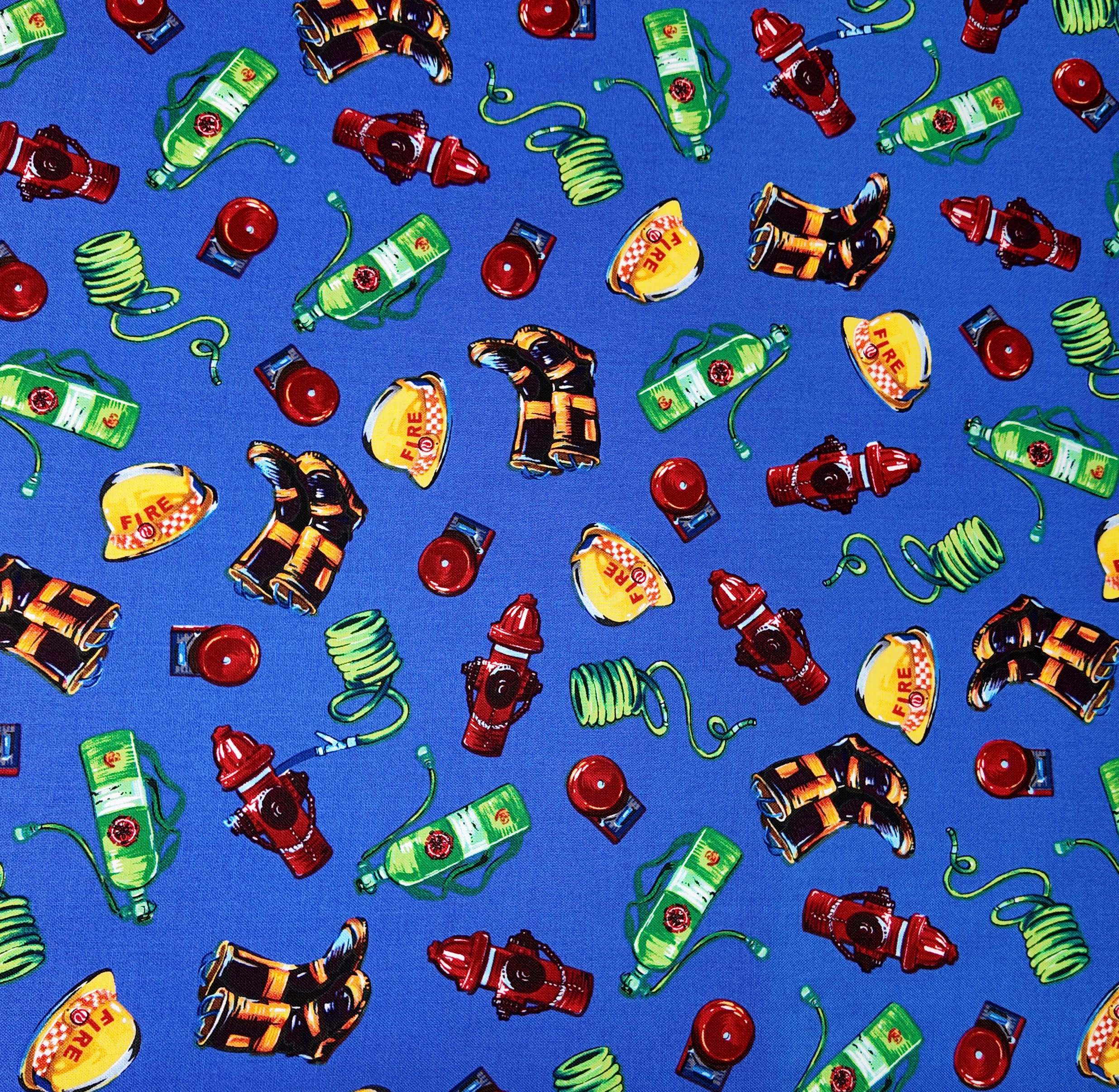 Sur un fond bleu intense, les emblèmes des pompiers prennent vie : casques jaunes, lances vertes, extincteurs et hydrants rouges. Un motif vibrant, plein de courage et d’énergie, qui évoque l’esprit de secours et d’aventure.