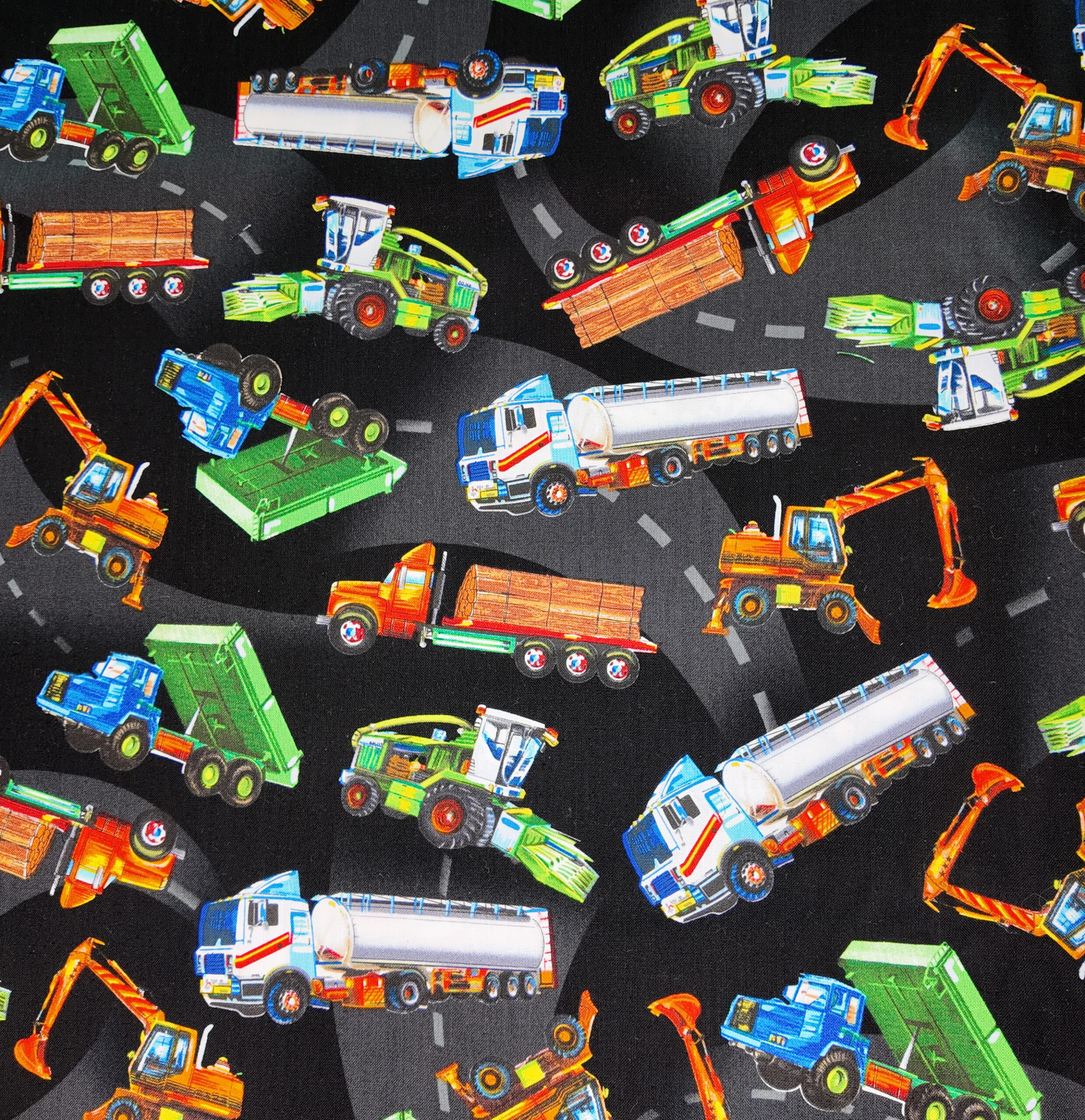 Les routes sombres s’animent de machines puissantes : camions, pelles et engins agricoles colorés sillonnent un paysage de chantier. Une ode au mouvement et à la robustesse du monde des travaux publics.