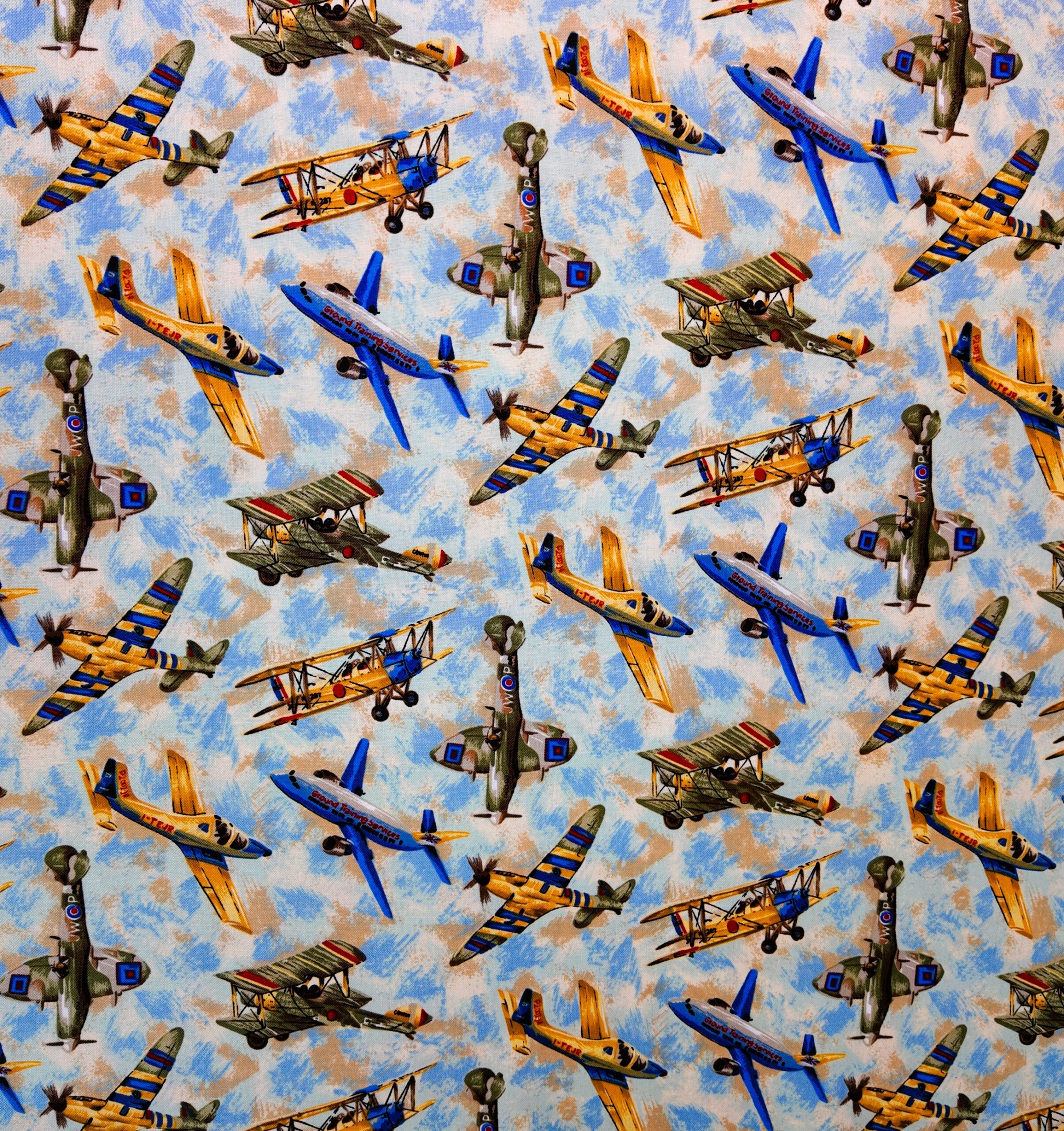 Des avions de légende sillonnent un ciel nuageux aux teintes bleues et dorées. Le tissu capture la magie du vol et l’élégance des appareils d’époque, dans une atmosphère de liberté aérienne.