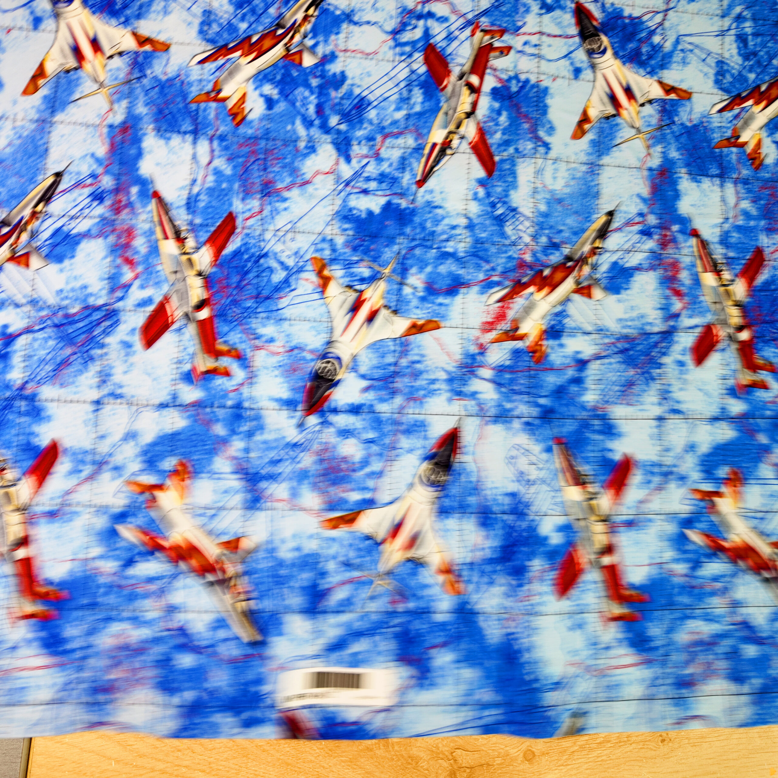 Dans un ciel vibrant de bleu, des avions modernes tracent leurs trajectoires rouges et blanches. Le tissu évoque la précision, la vitesse et la puissance du vol acrobatique.