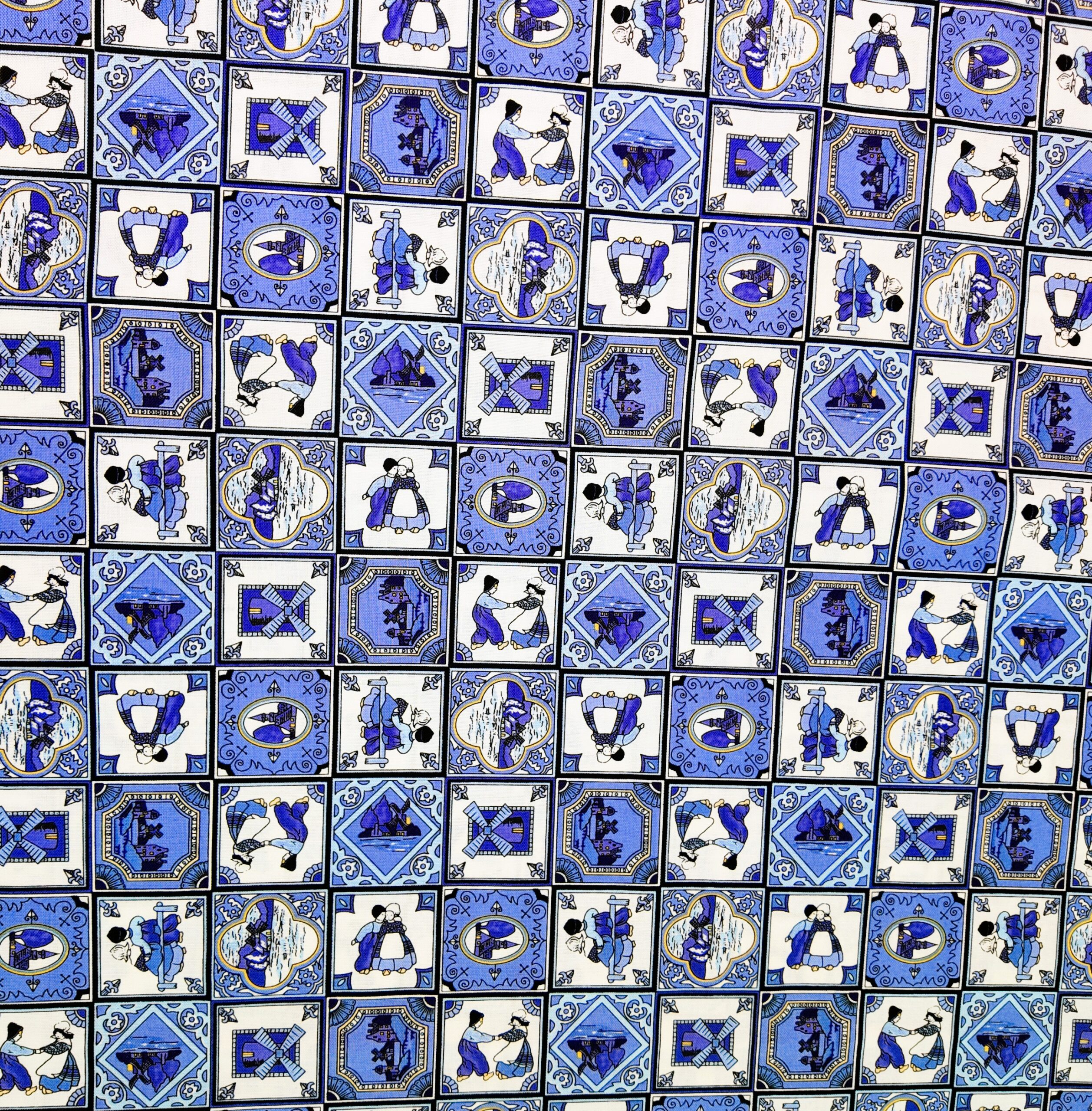 Carrés décoratifs d’inspiration faïence, où des silhouettes en costume traditionnel s’animent en bleu et blanc. Le tissu évoque l’élégance des carreaux anciens et le charme du folklore.