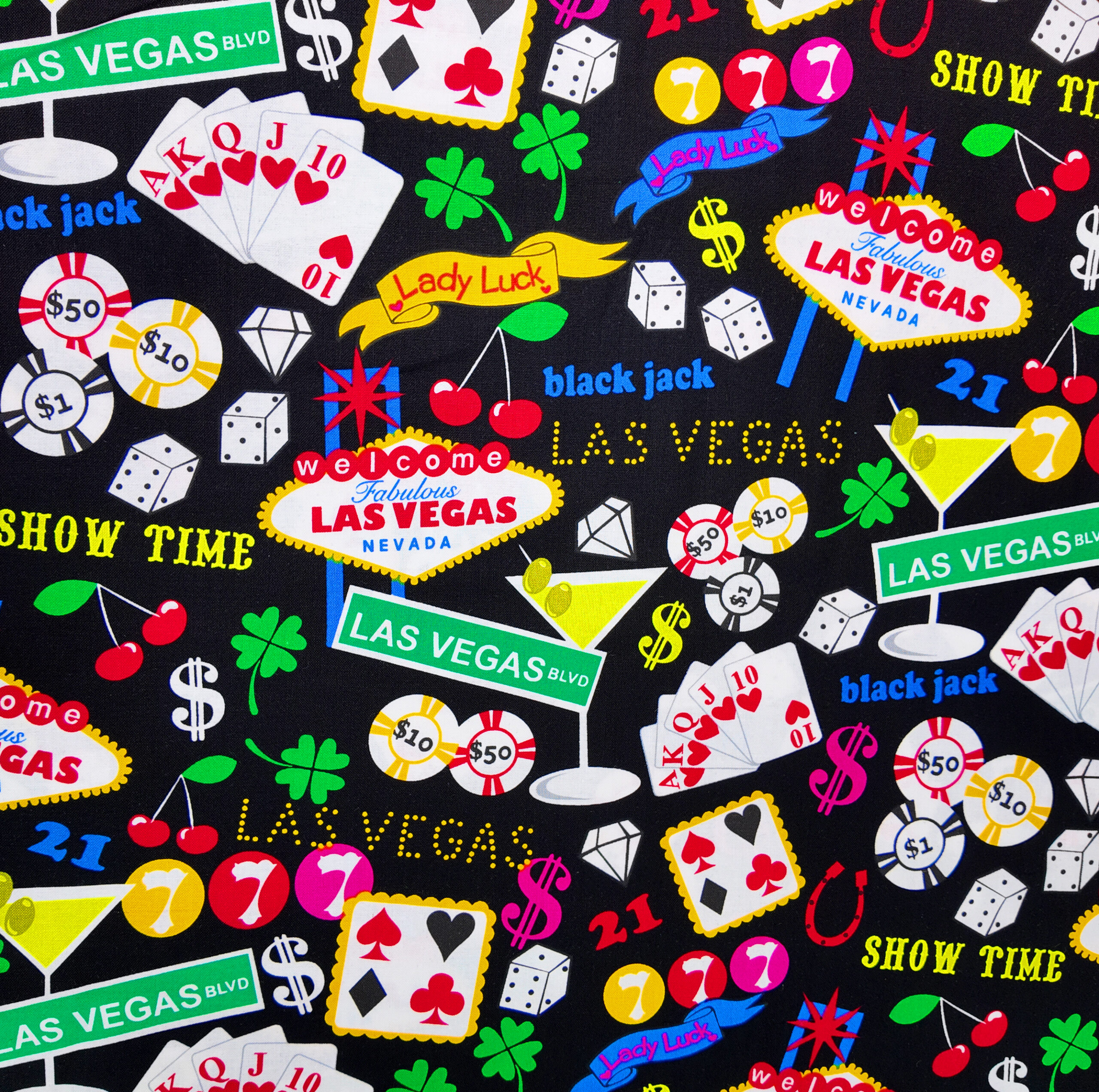 Explosion de couleurs et d’énergie : cartes, dés et enseignes lumineuses font vibrer l’esprit de Las Vegas. Le tissu célèbre le hasard, la fête et la chance.