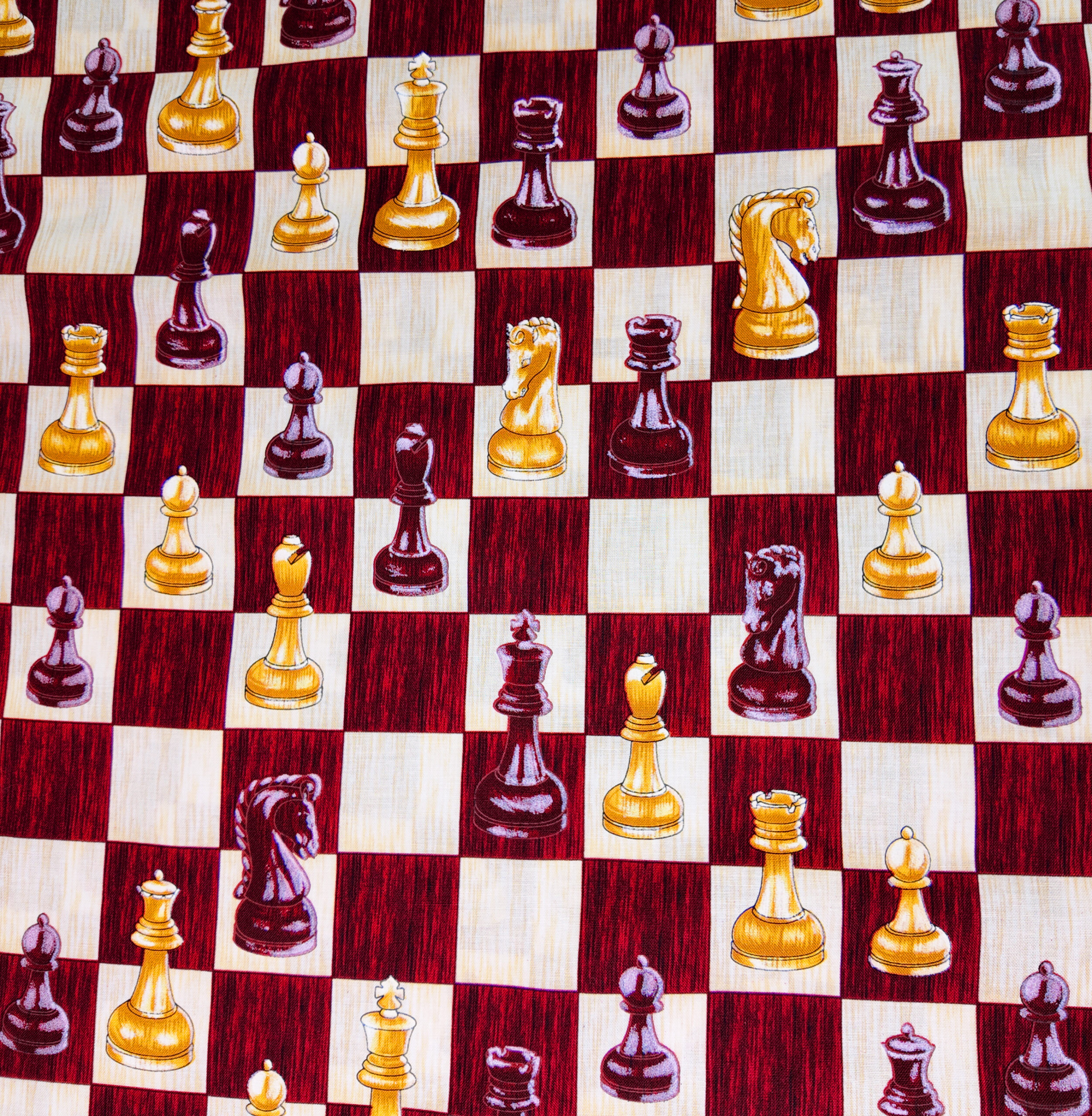 Sur un échiquier bordeaux et beige, les pièces dorées et brunes se livrent un duel noble. Le tissu dégage une atmosphère de calme et d’intelligence en mouvement.