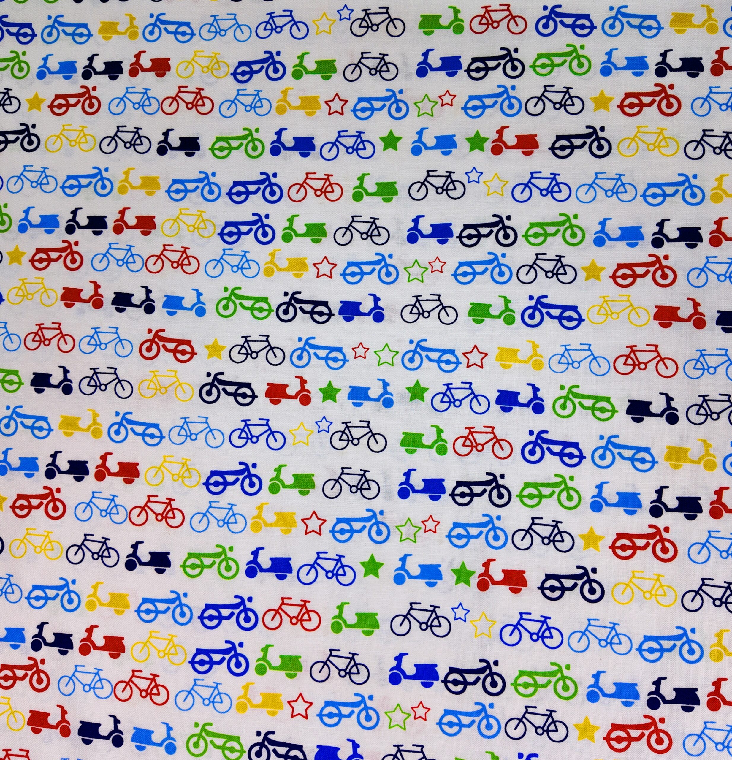 Une farandole de vélos, scooters et mobylettes aux couleurs vives se déploie sur fond blanc. Le tissu respire la légèreté, la mobilité et la joie de circuler librement.