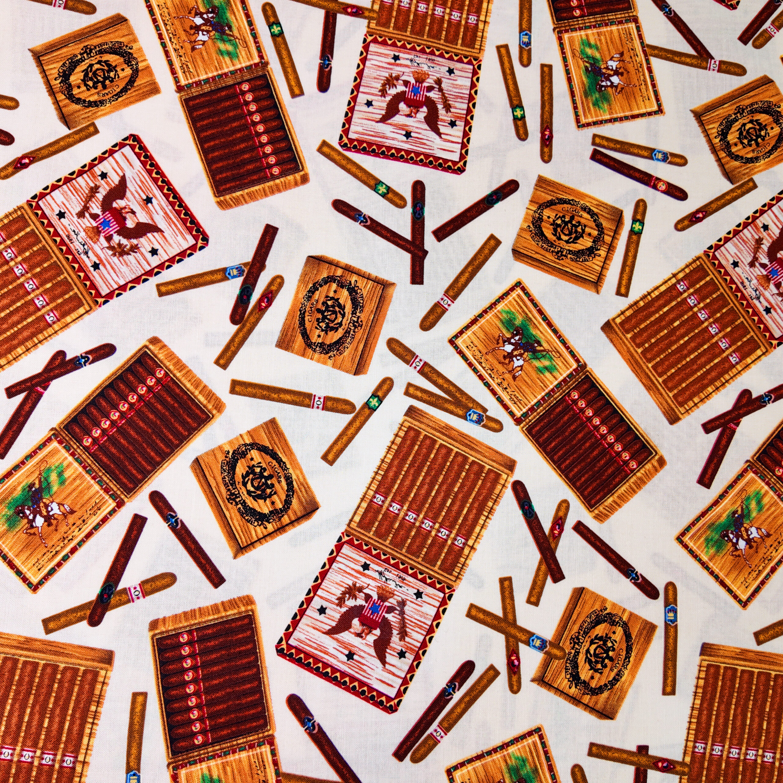 Sur un fond crème, des boîtes de cigares richement décorées s’ouvrent, révélant des nuances de brun et d’ambre. Le tissu évoque les effluves des voyages lointains et l’art du raffinement cubain.