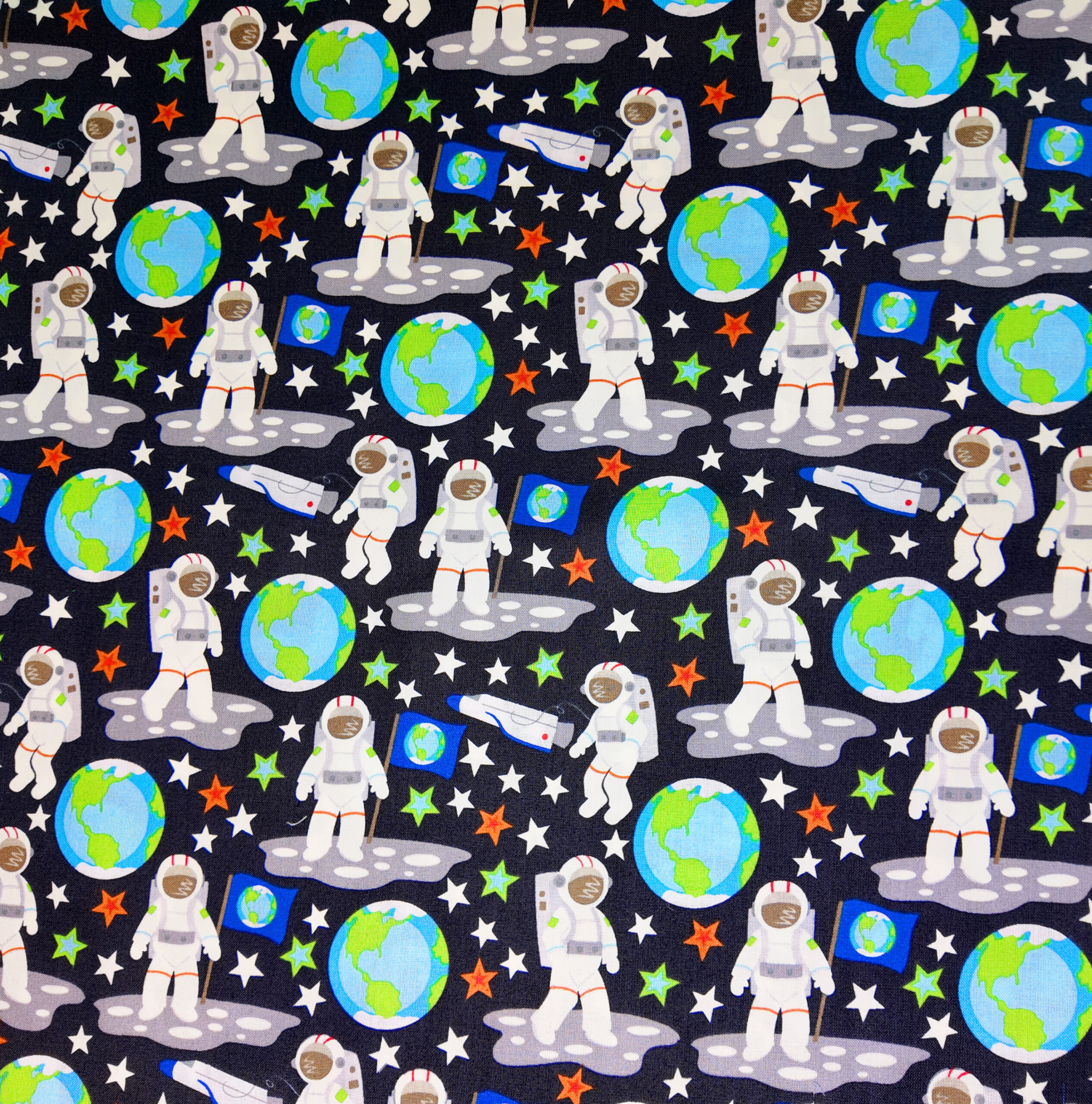 Des astronautes joyeux foulent la lune parmi les planètes et les étoiles, dans un ballet coloré de bleu, vert et orange. Ce tissu évoque l’aventure, la découverte et les rêves d’enfance tournés vers l’espace infini.