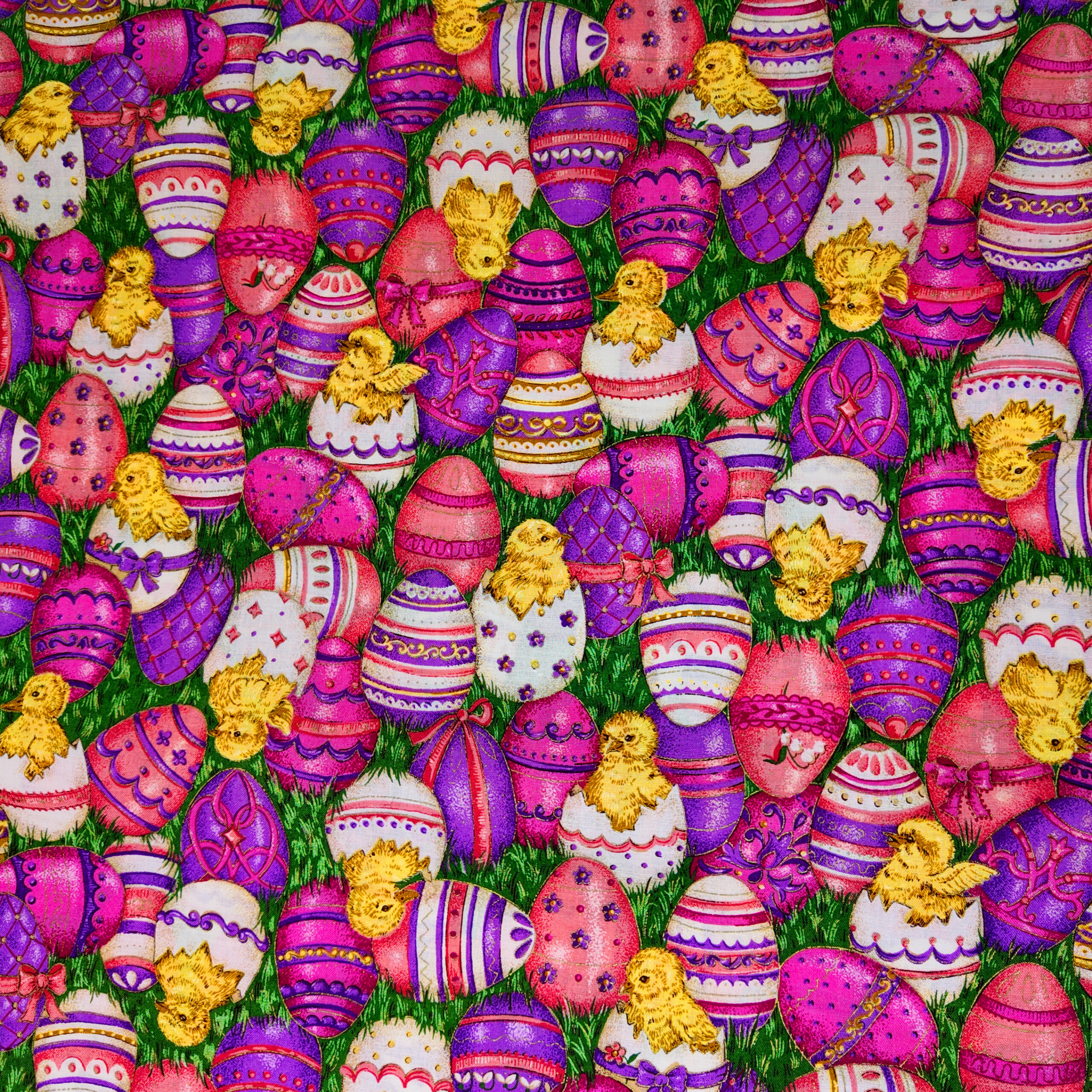 Des œufs richement décorés se mêlent à de joyeux poussins dorés sur un tapis d’herbe éclatant. Ce tissu évoque la joie du printemps et le bonheur des chasses aux œufs.