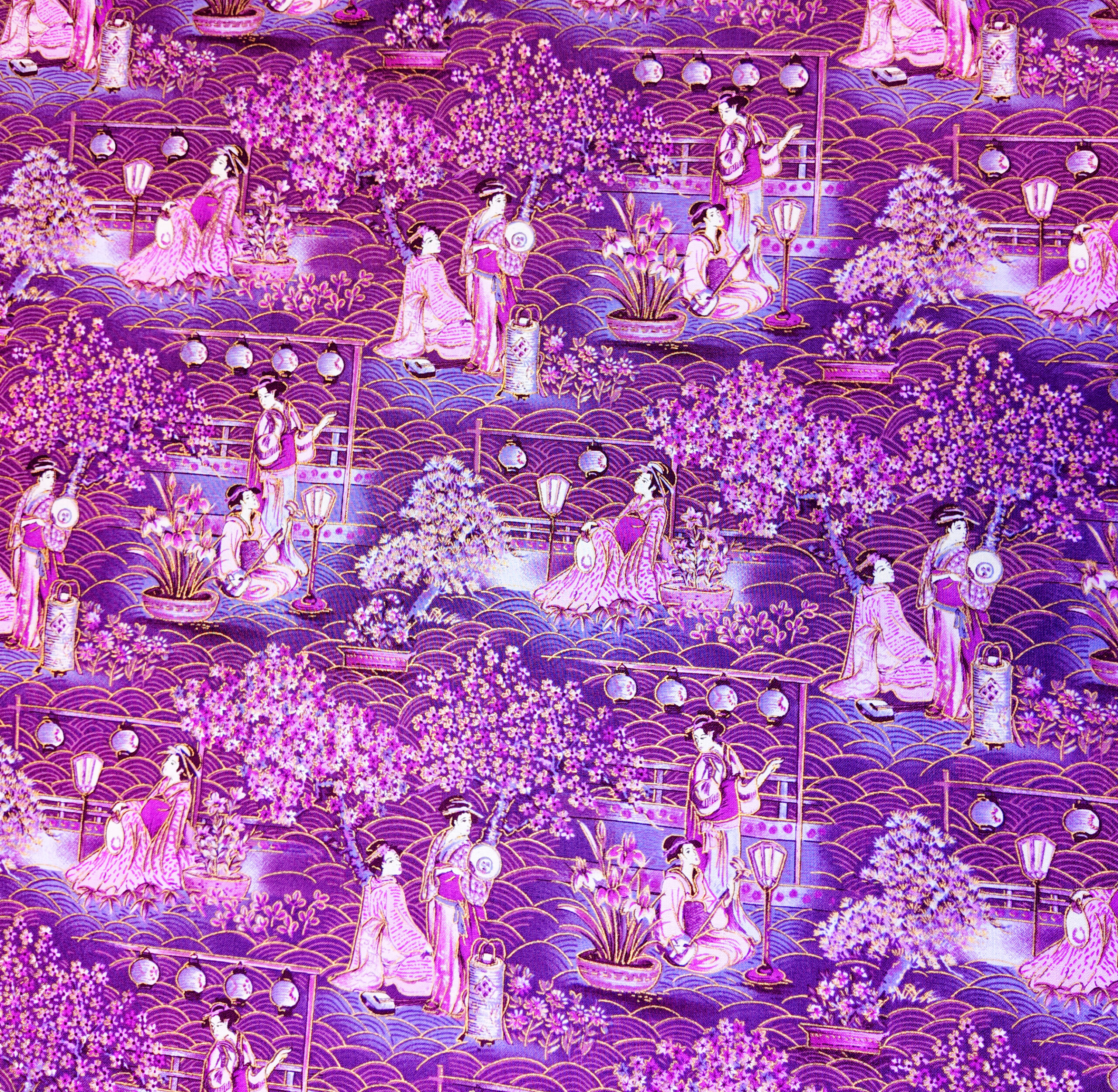 Scène japonaise baignée de mauve et d’or, où des femmes en kimono flânent parmi les cerisiers en fleurs. Ce tissu délicat invite à la rêverie et à la beauté du printemps.