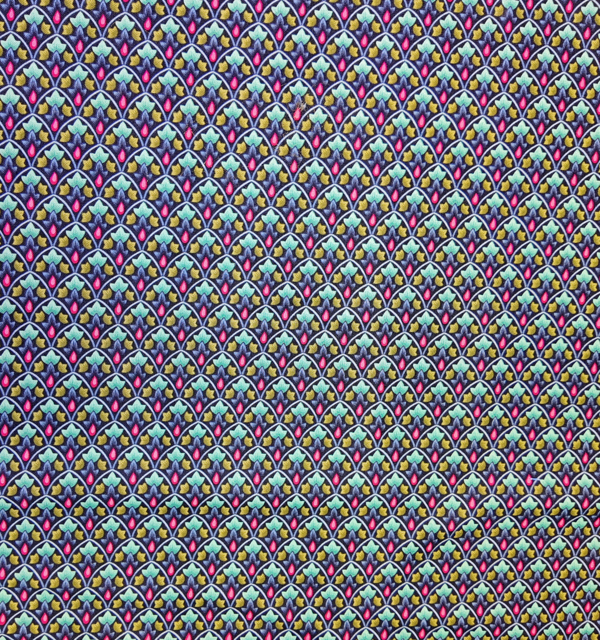 Un jeu d’arabesques géométriques se déploie en vagues harmonieuses de turquoise, vert et bleu nuit, ponctuées de touches carmin. Un univers hypnotique aux reflets d’éventail art déco.