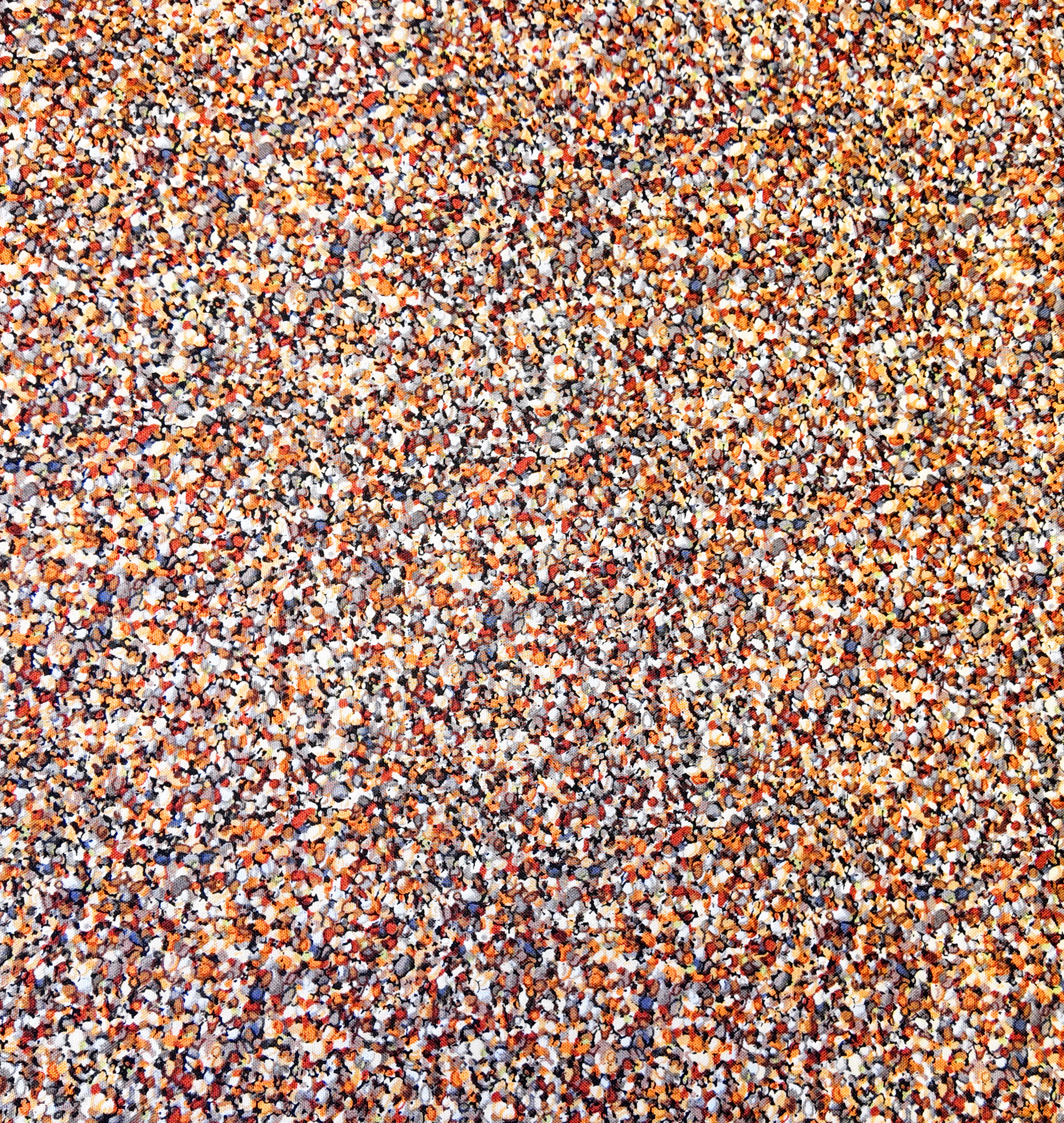 Un tapis de petits galets aux tons miel, roux et gris compose une mosaïque naturelle. Le tissu rappelle la chaleur du sable et le murmure des rivages.