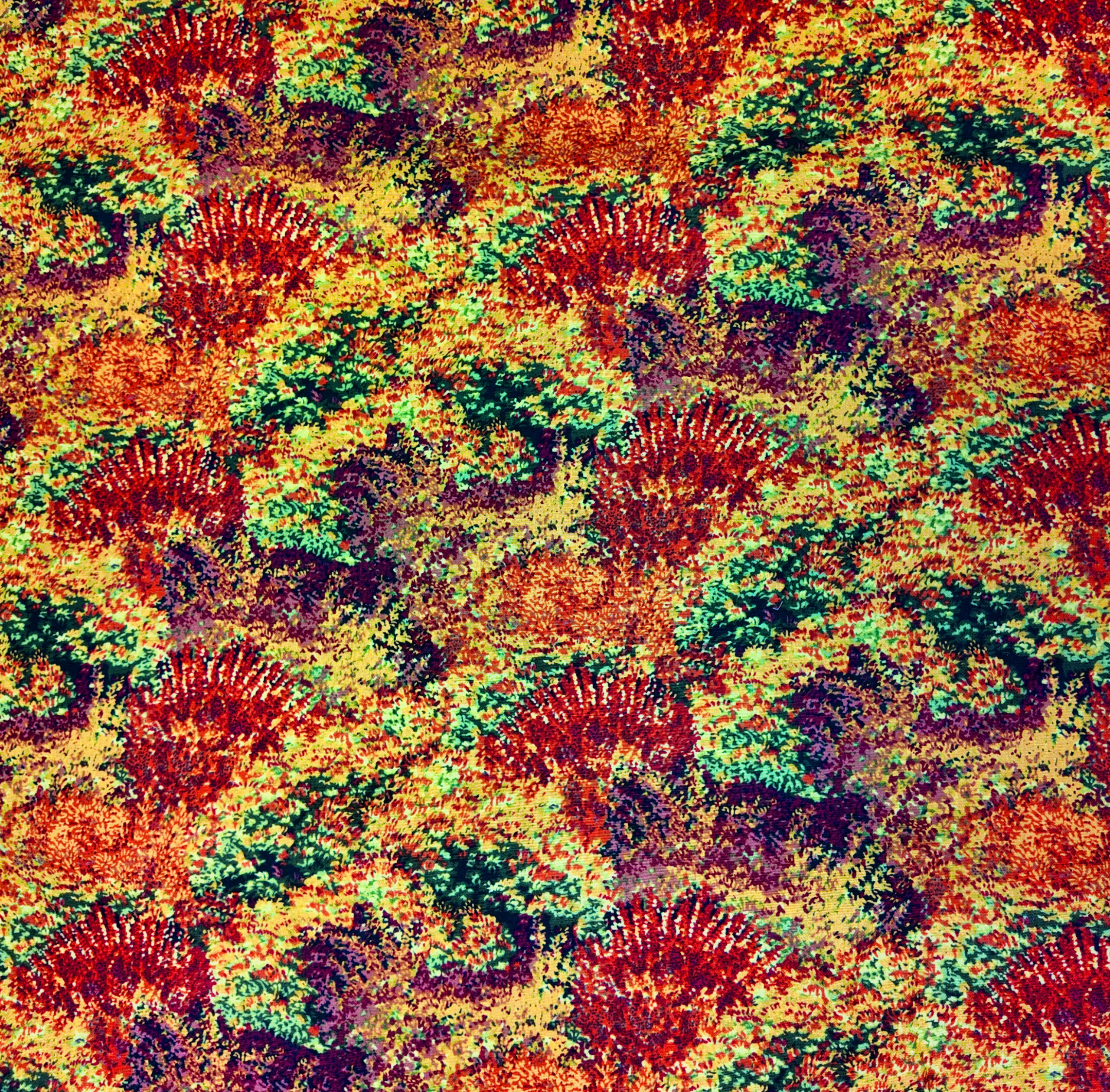 Une explosion de couleurs embrase le tissu, mêlant rouge, or, vert et violet dans un feuillage incandescent. Il évoque la chaleur vibrante d’une forêt tropicale en feu d’artifice