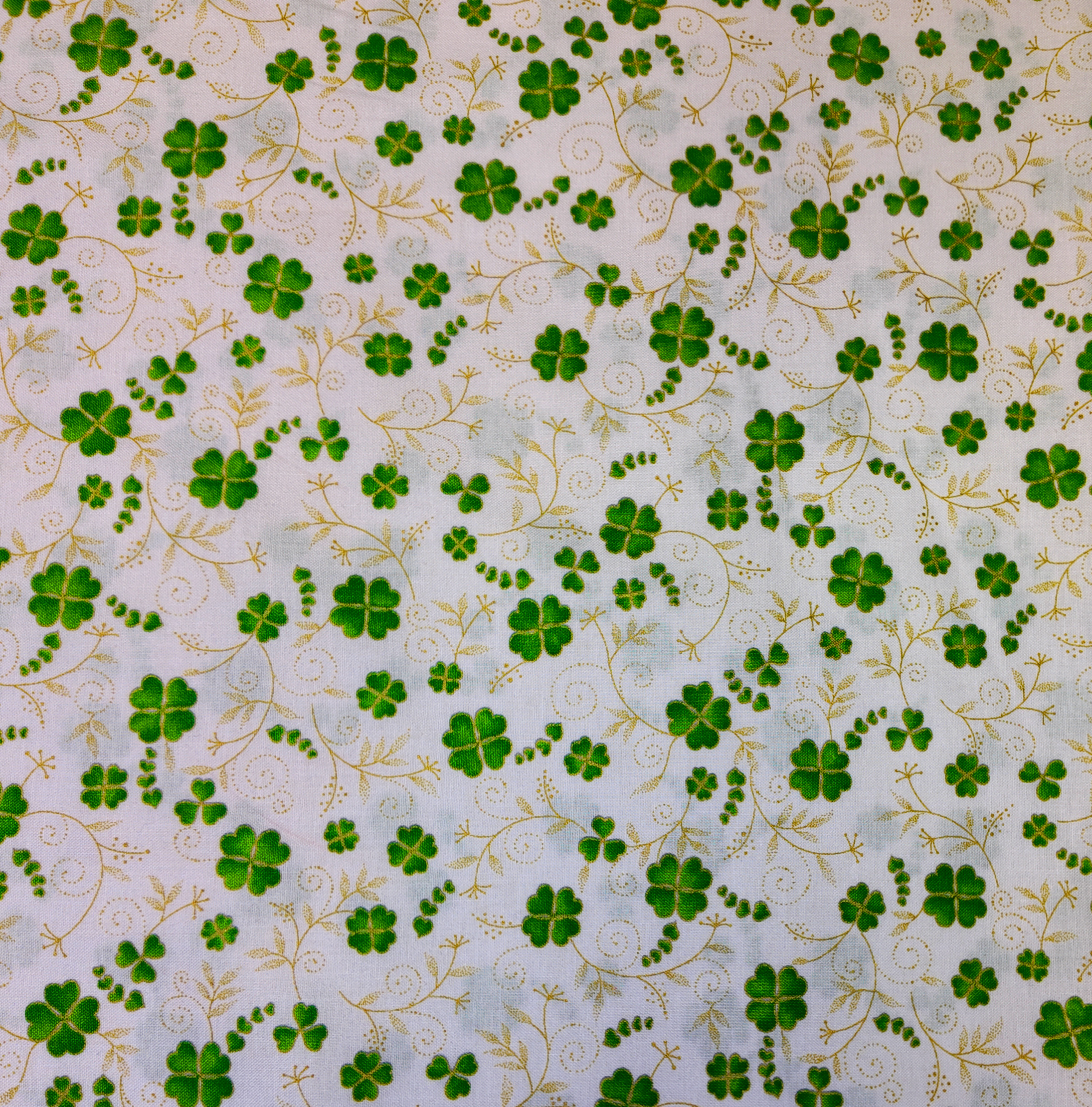 Des trèfles verts et des arabesques dorées dansent sur un fond clair, apportant une touche de chance et de fraîcheur printanière. Un tissu porte-bonheur aux reflets lumineux.