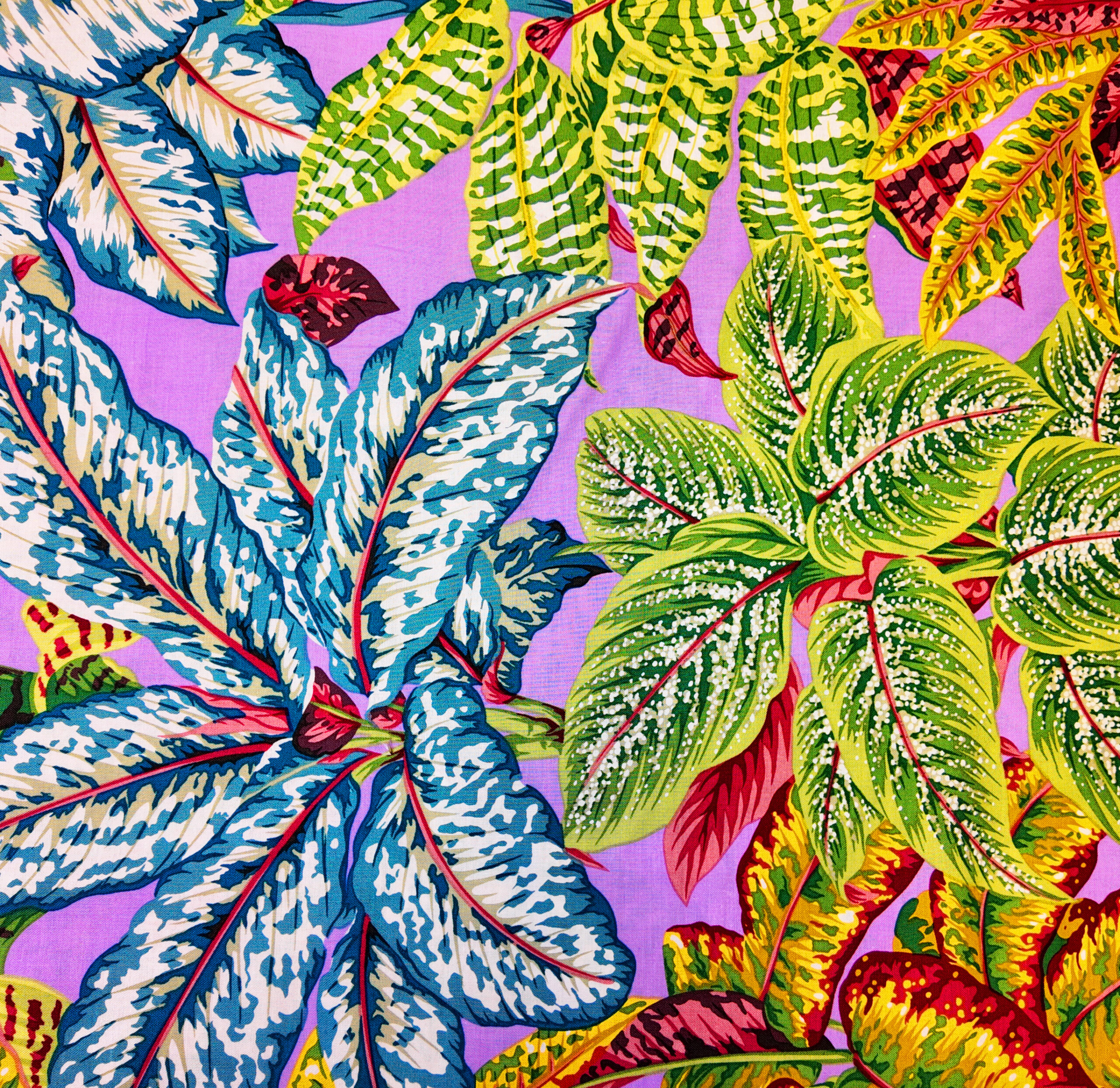Sur un fond violet éclatant, de larges feuilles tropicales aux nuances bleu turquoise, vert et or s’épanouissent avec audace. Un tissu vibrant et exotique.