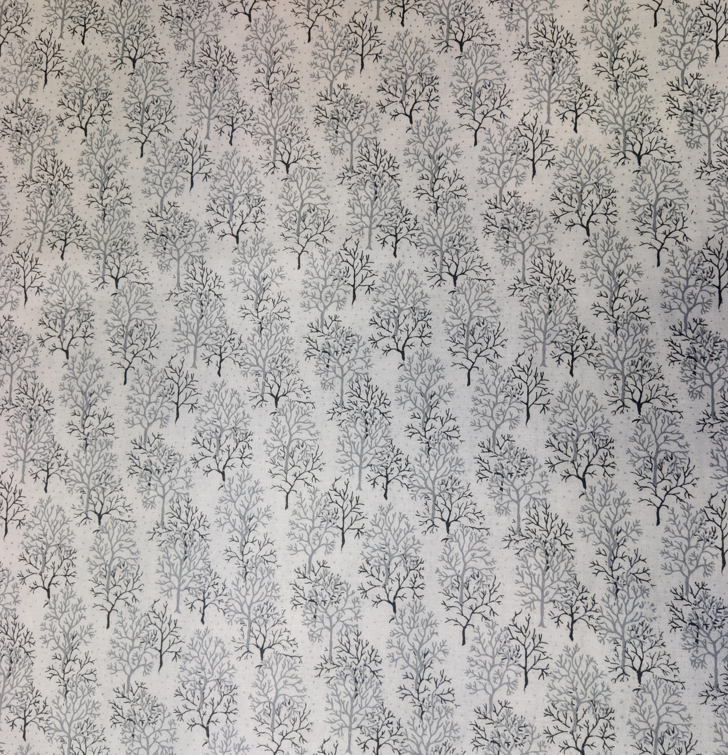 Des arbres graciles se dressent sur un fond blanc neigeux, dessinant un paysage hivernal tout en finesse. Le motif respire la pureté et le silence de l’hiver.