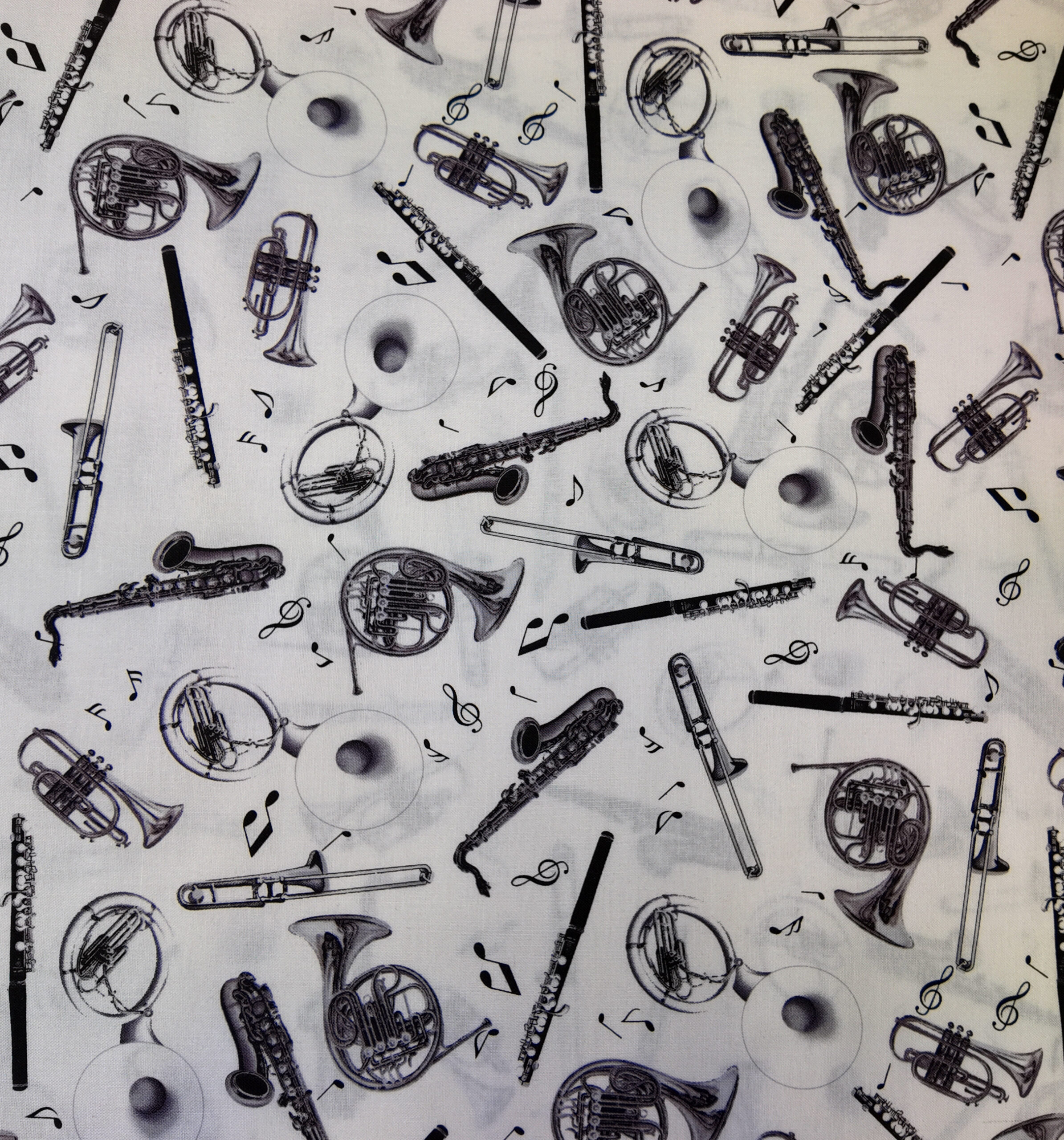 Une mélodie visuelle s’élève sur fond blanc : trompettes, clarinettes et cors s’entrelacent parmi des notes noires. Le tissu célèbre l’harmonie et la vivacité du jazz.