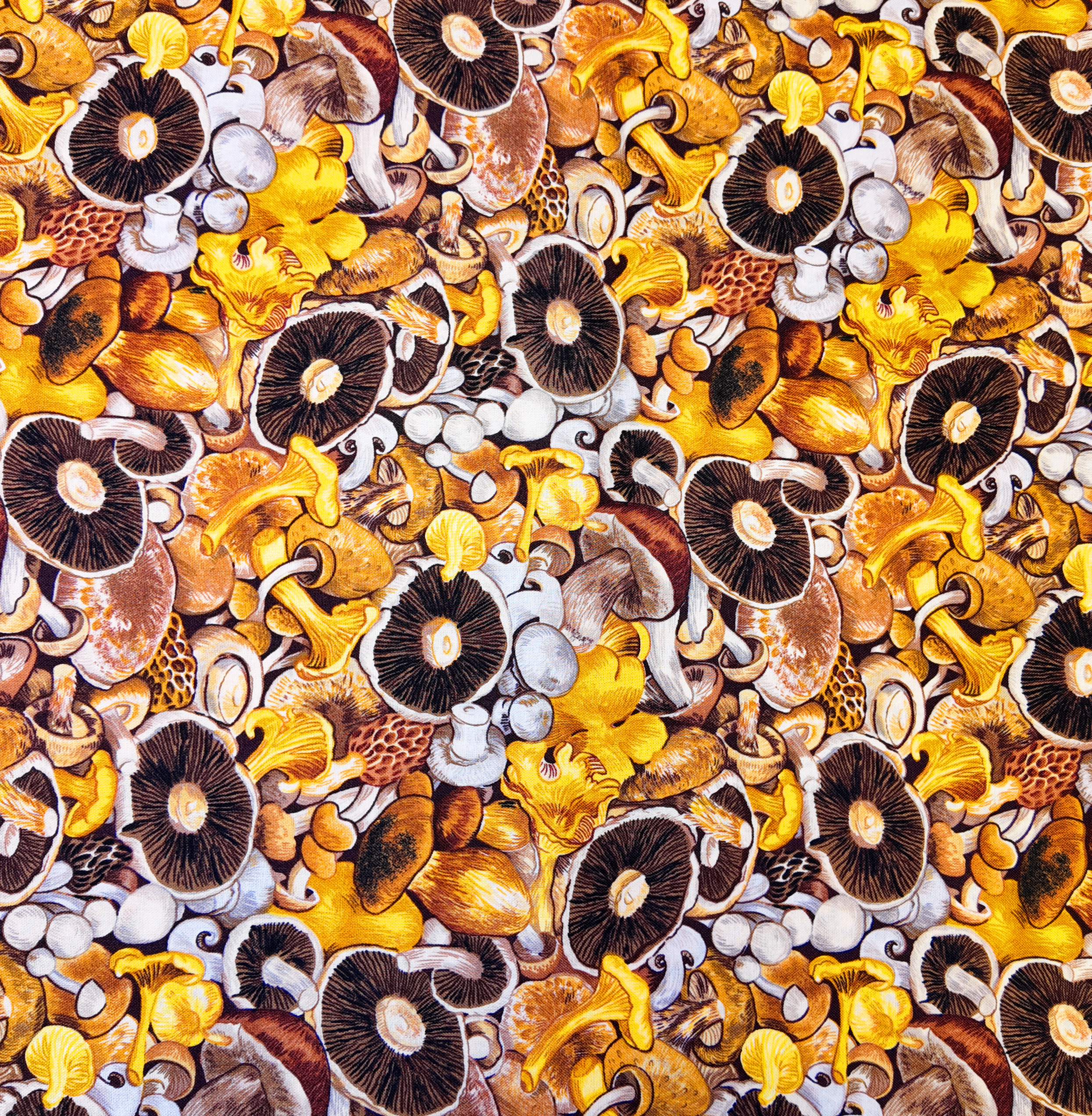 Un panier de forêt s’invite sur ce tissu : girolles dorées, cèpes bruns et morilles s’entremêlent dans une symphonie automnale. Une ode à la nature généreuse.