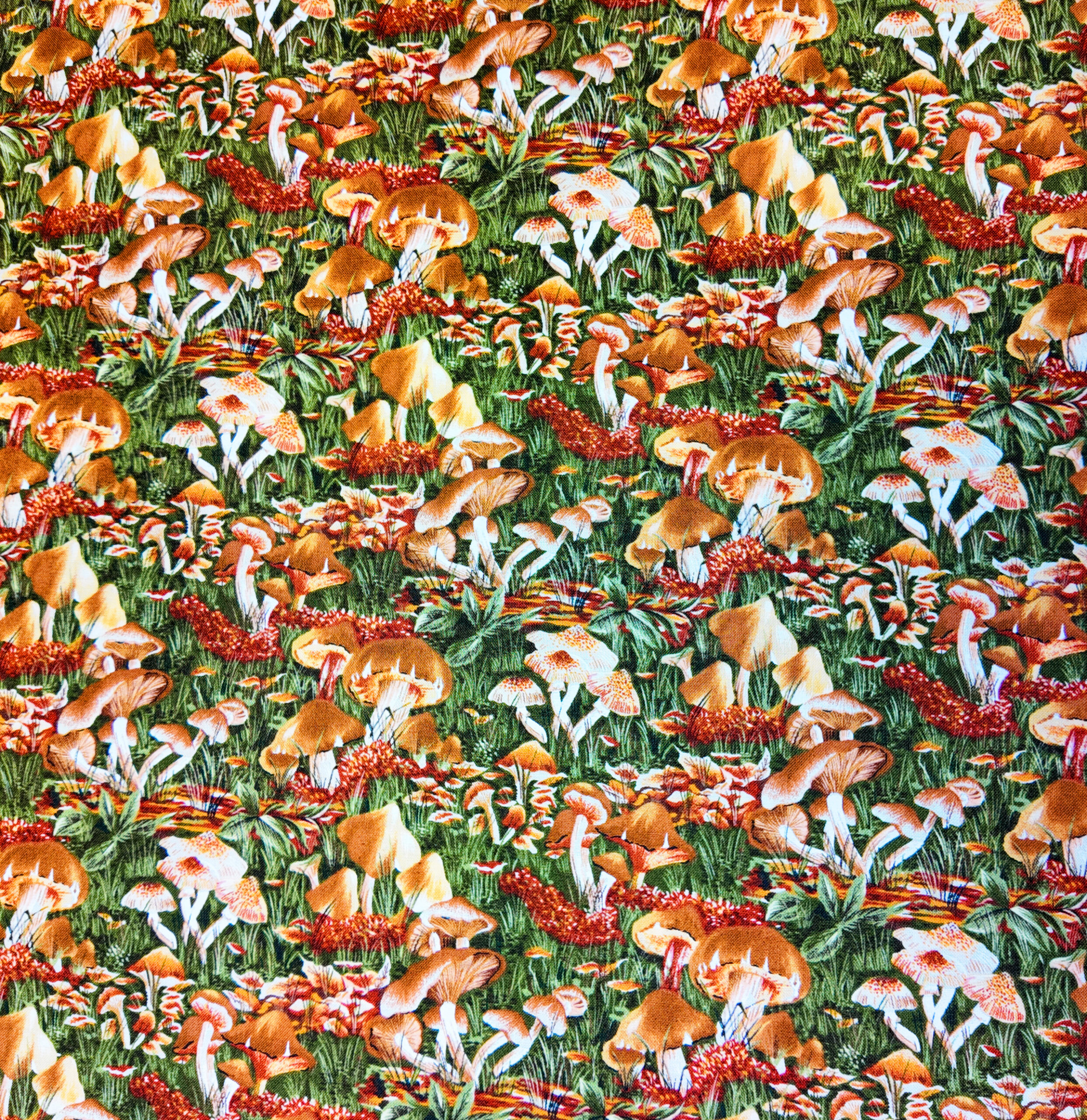 Un tapis foisonnant de champignons bruns et orangés s’épanouit sur un lit d’herbes vertes. Ce tissu évoque la forêt après la pluie, vibrante et parfumée.
