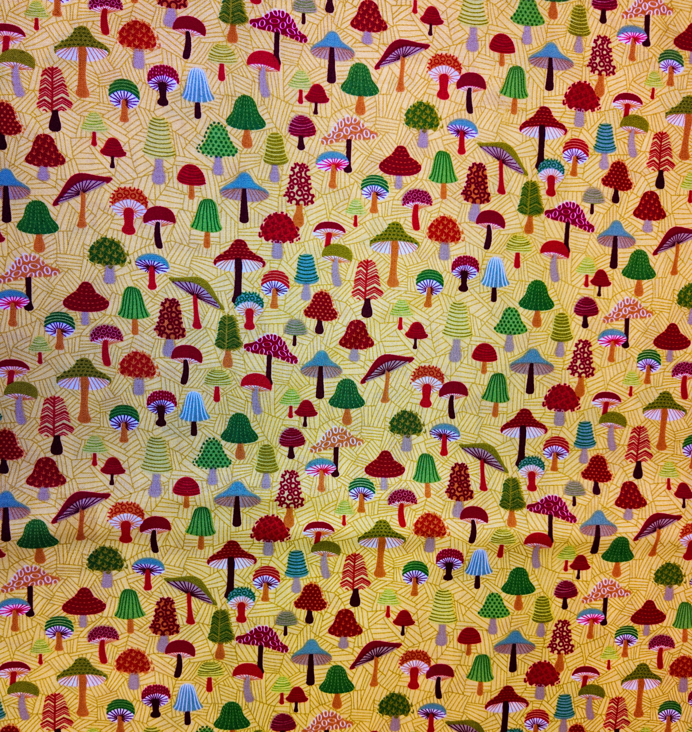 Des champignons stylisés multicolores s’élèvent sur un fond jaune doré. Un univers joyeux et fantaisiste qui rappelle les contes d’enfance.