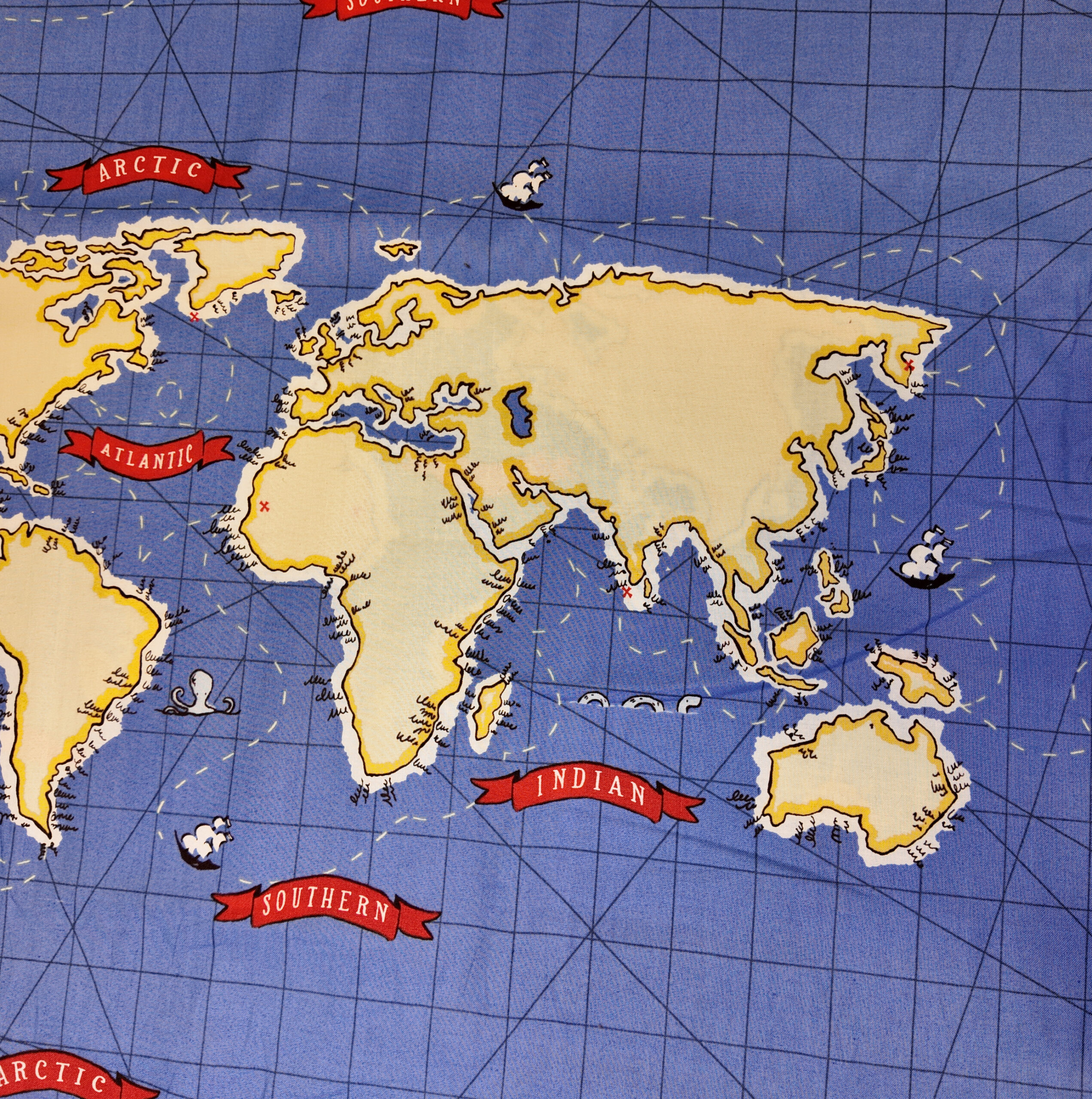 Une carte du monde se déploie sur fond bleu océan, décorée de bannières rouges et de contours dorés. Un appel au voyage et à la découverte.