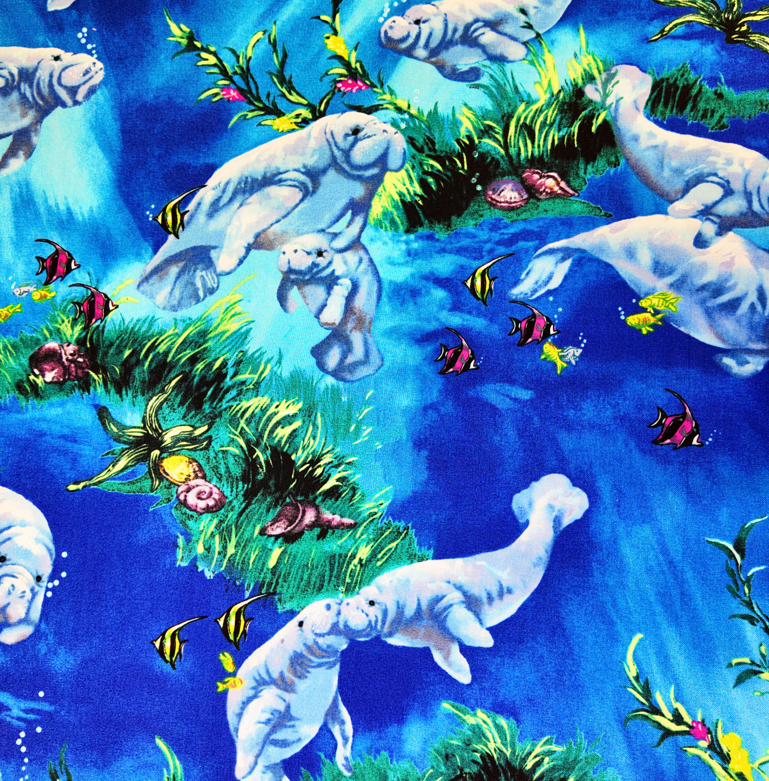 Dans une mer bleu azur, lamantins et poissons colorés glissent paisiblement parmi les herbes marines. Un tissu empreint de douceur et de sérénité.