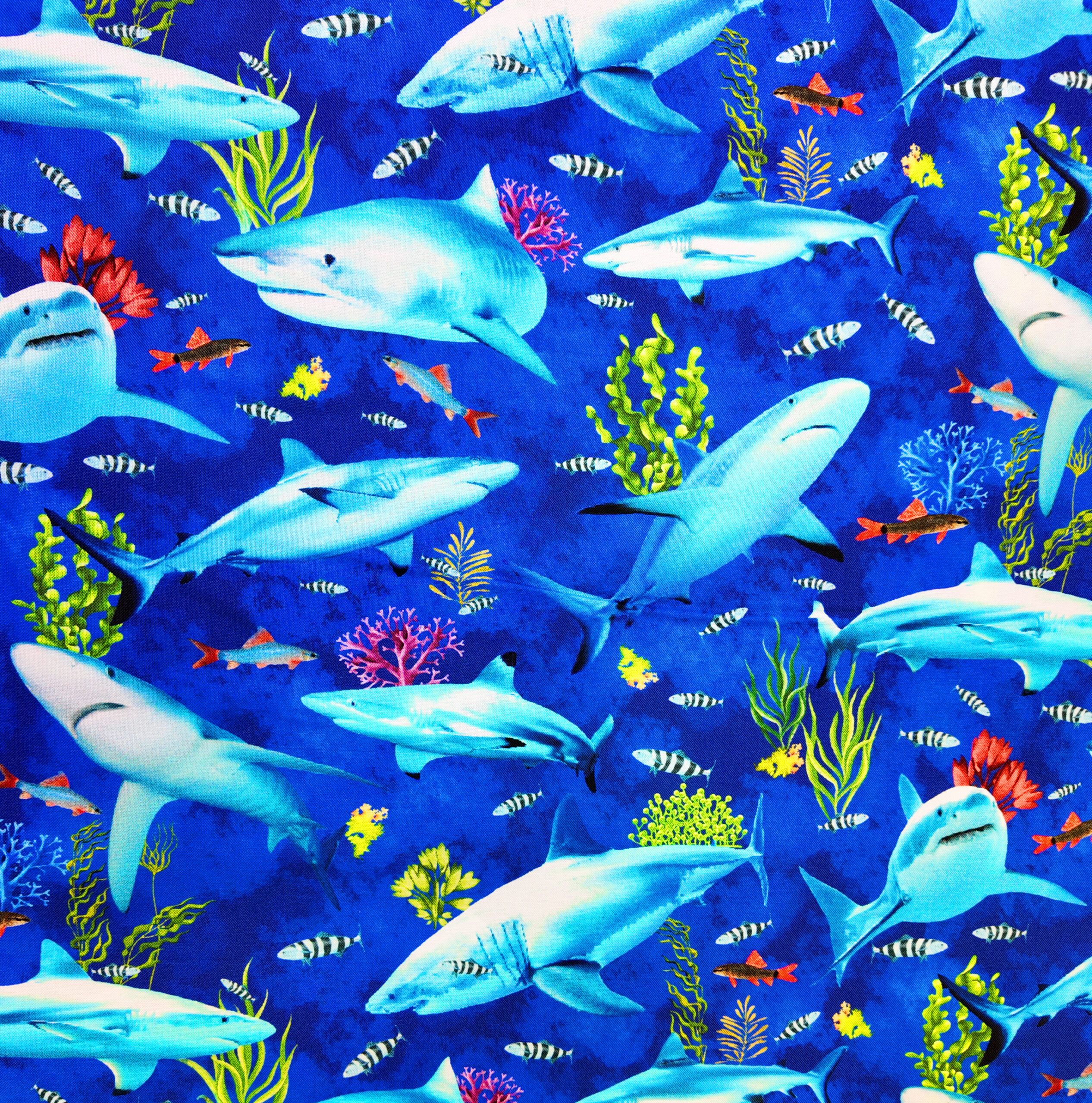 Sur fond bleu profond, des requins majestueux croisent bancs de poissons et coraux éclatants. Un motif puissant et vivant, hommage à la mer sauvage.