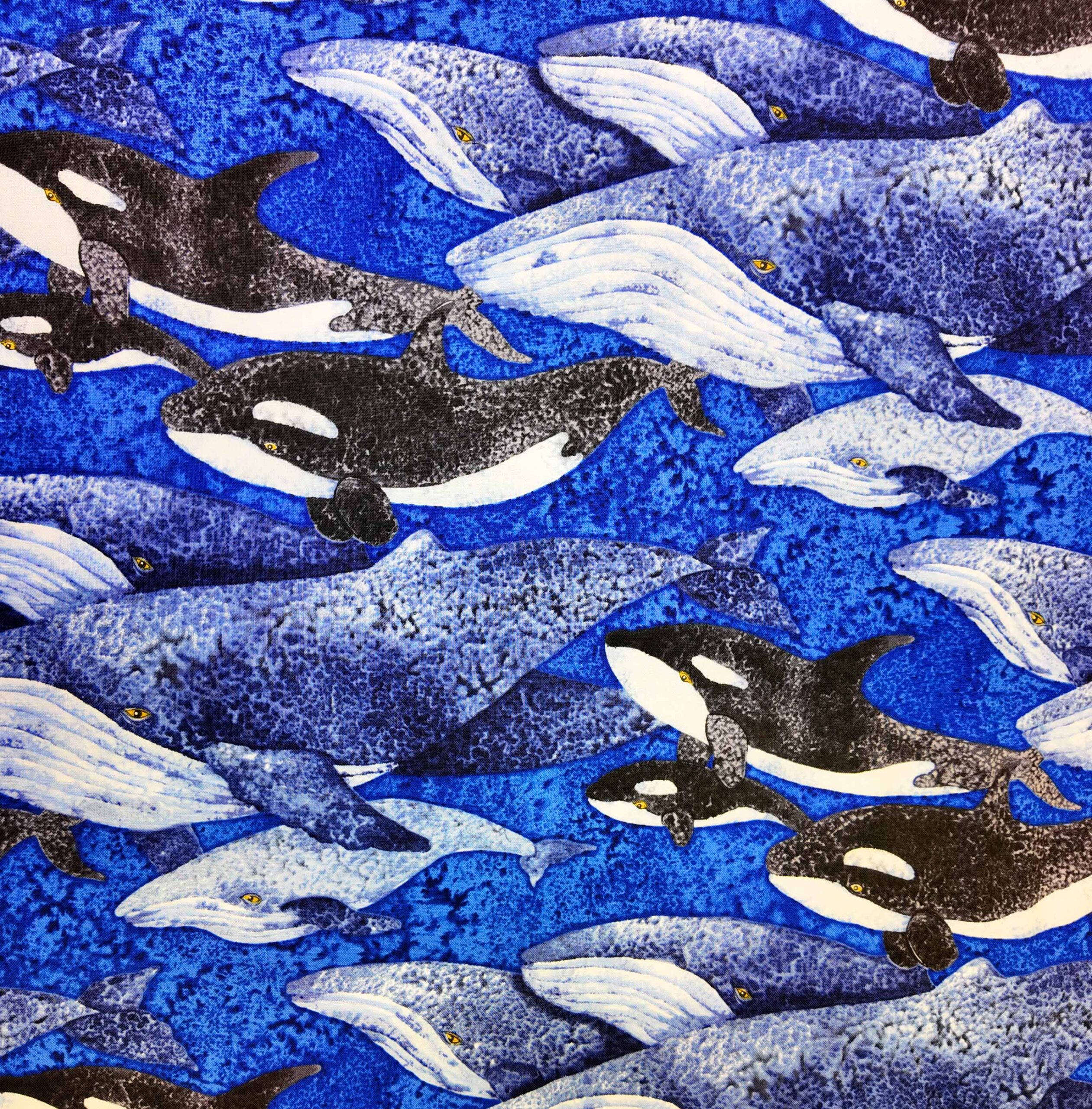 Un ballet d’orques et de baleines glisse dans un océan vibrant d’azur. Les nuances de bleu s’entrelacent dans un mouvement apaisant, évoquant la puissance tranquille des profondeurs marines.
