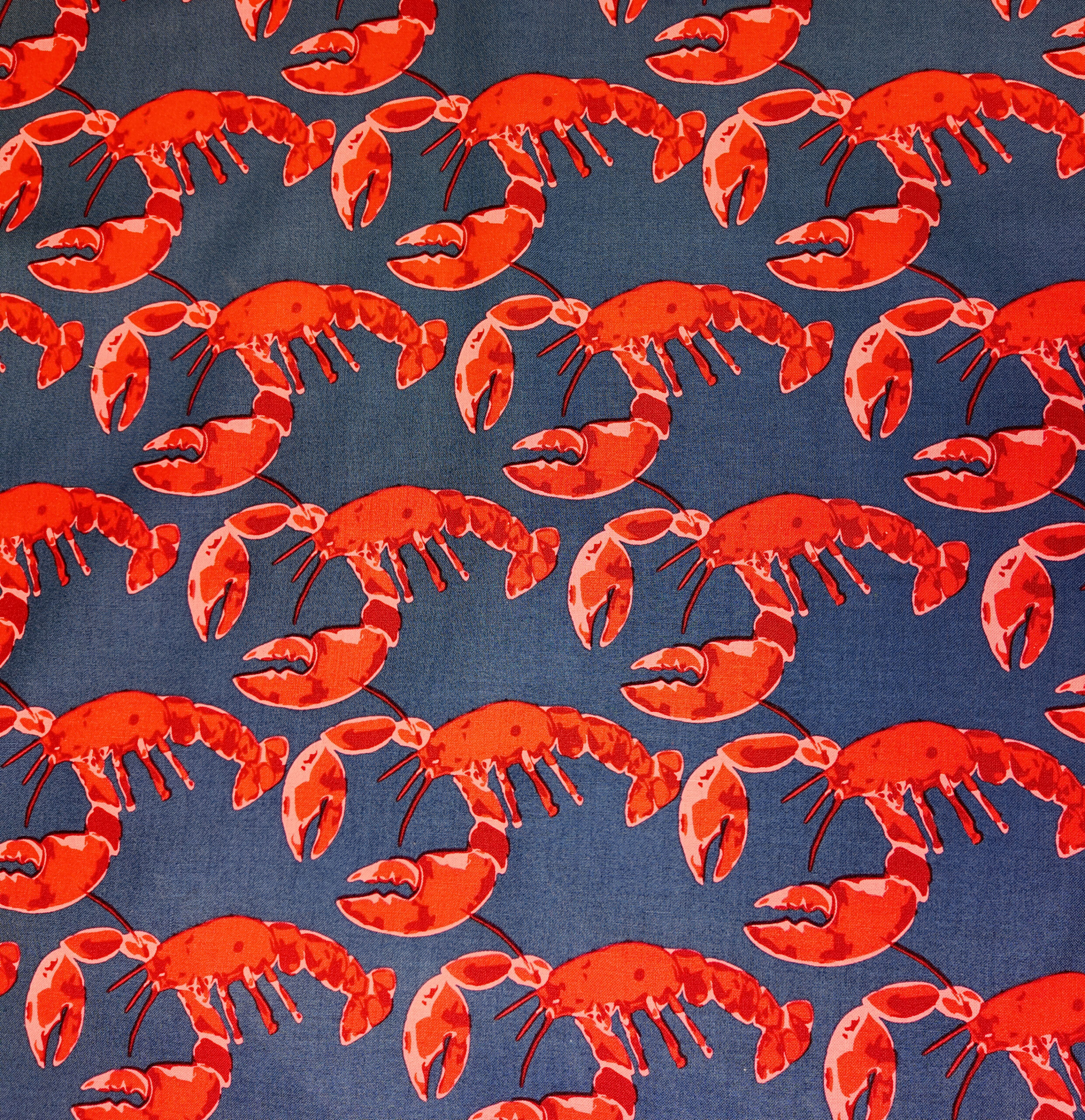 Les homards écarlates se répètent comme une farandole joyeuse sur un fond bleu profond. L’ensemble dégage une énergie vive et iodée, rappelant les étals colorés des ports de pêche.