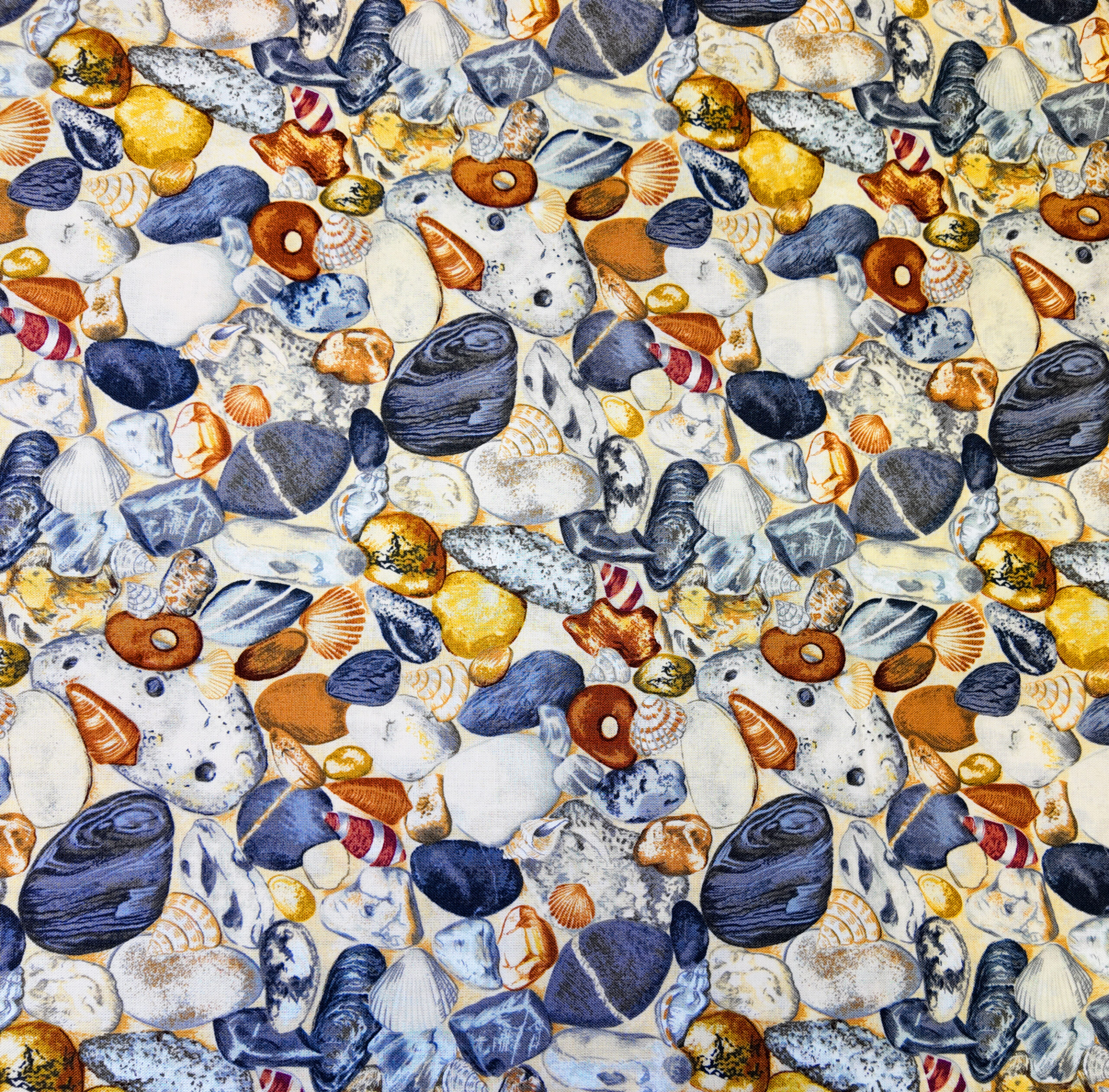 Un rivage foisonnant de galets polis et de coquillages chatoyants, aux reflets d’ambre, d’azur et de sable. Ce tissu évoque le murmure des vagues et la chaleur d’un après-midi au bord de mer.