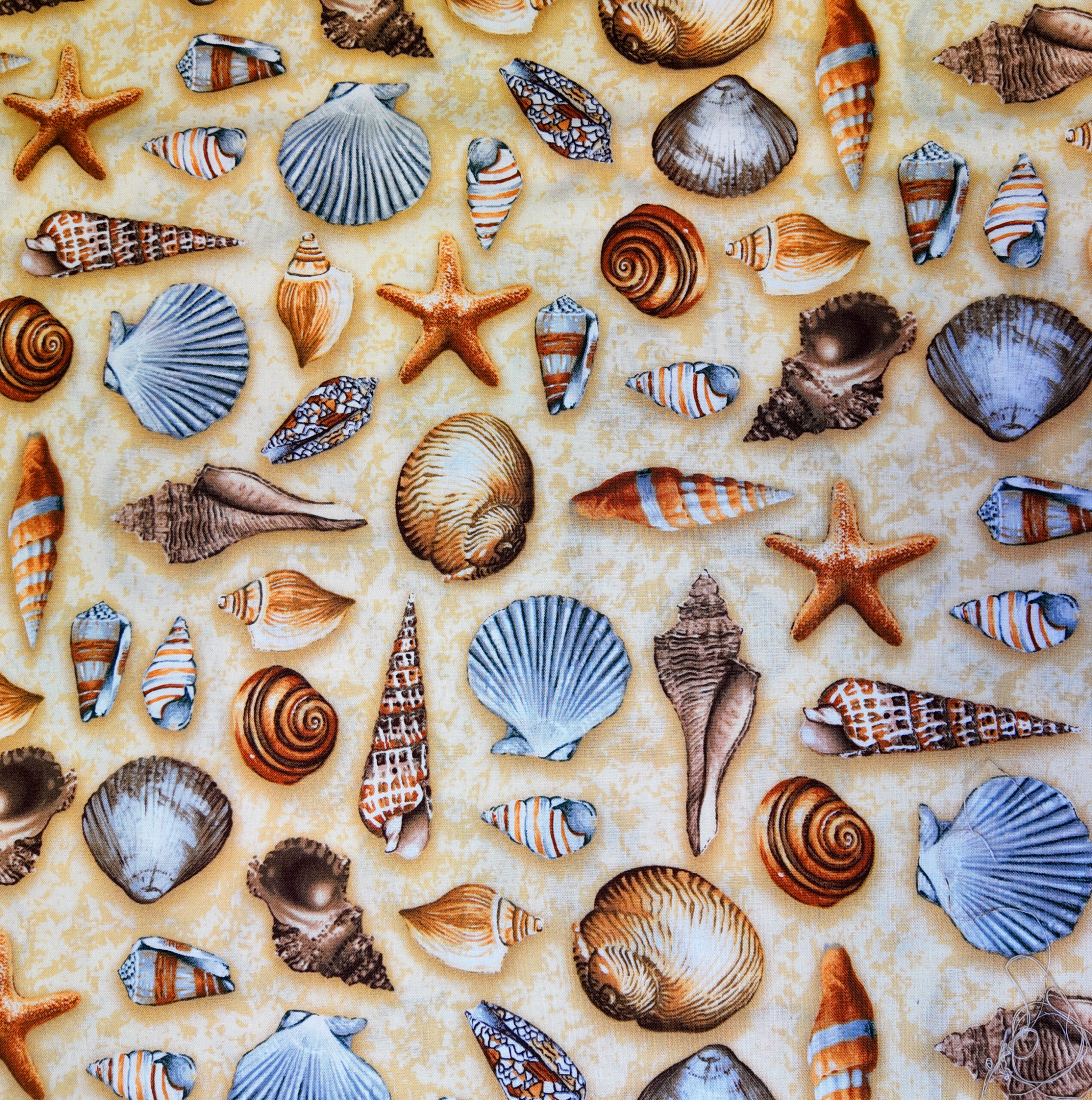 Des coquillages et étoiles de mer aux teintes de cuivre, de beige et de bleu pâle reposent sur un fond doré. Une atmosphère douce et lumineuse rappelant les collections d’été et les trésors ramenés des vacances.
