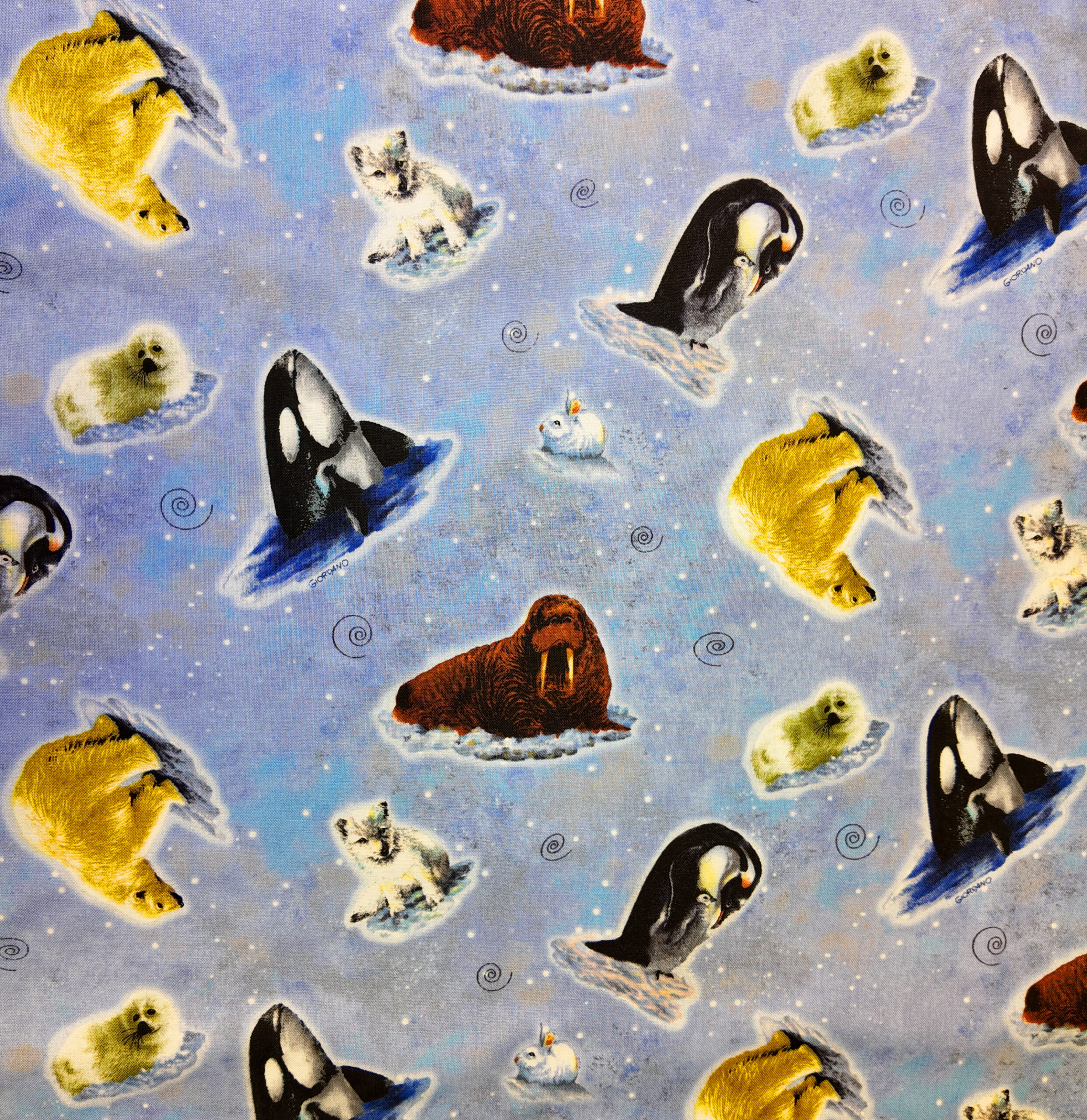 Sur un fond givré aux reflets bleus, ours polaires, phoques et pingouins se partagent la banquise. Un univers tendre et glacé, empreint de sérénité boréale.
