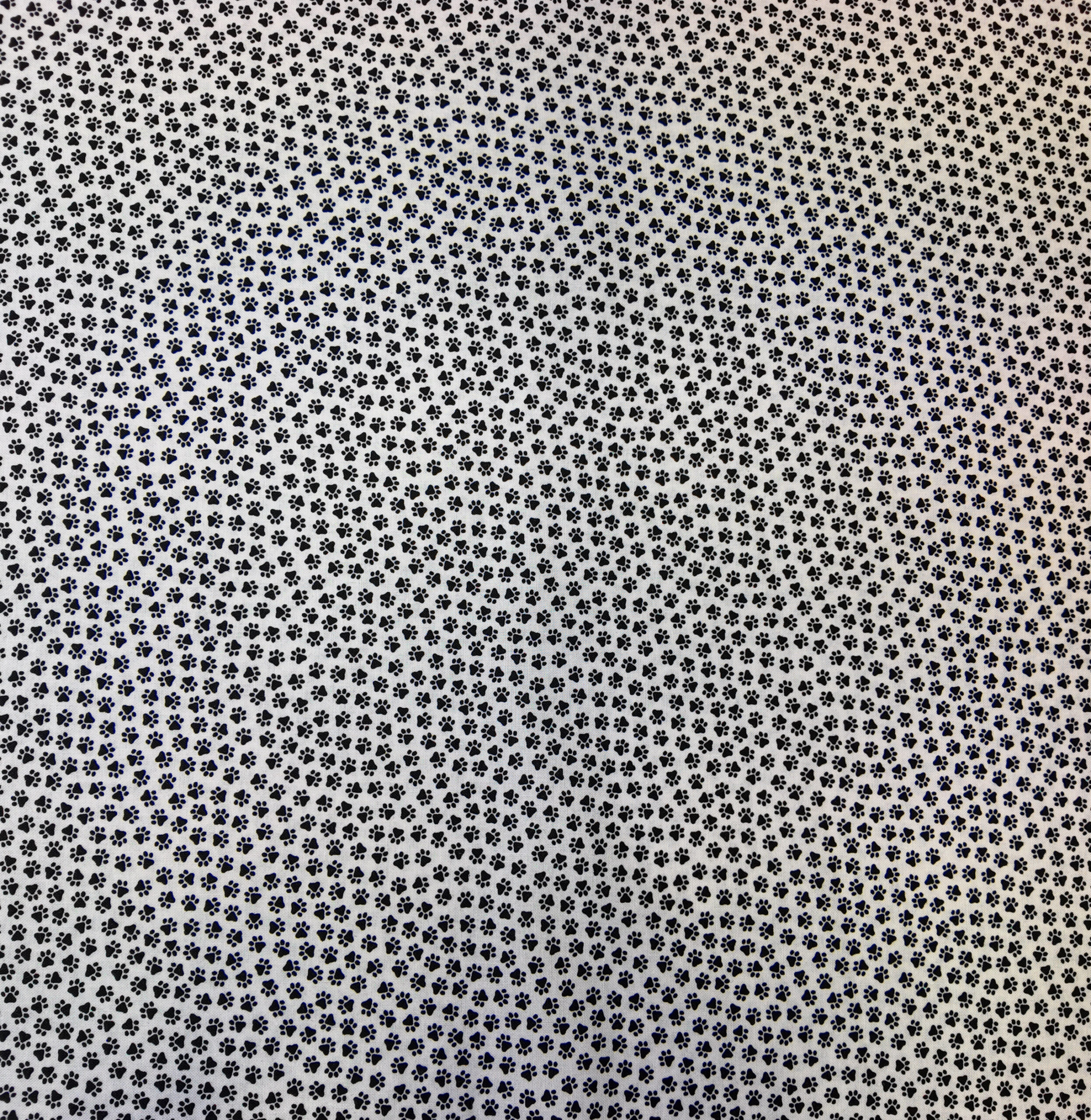 Un semis régulier de petites pattes noires sur fond blanc évoque la fidélité et la douceur des compagnons à quatre pattes. Sobriété et charme discret.