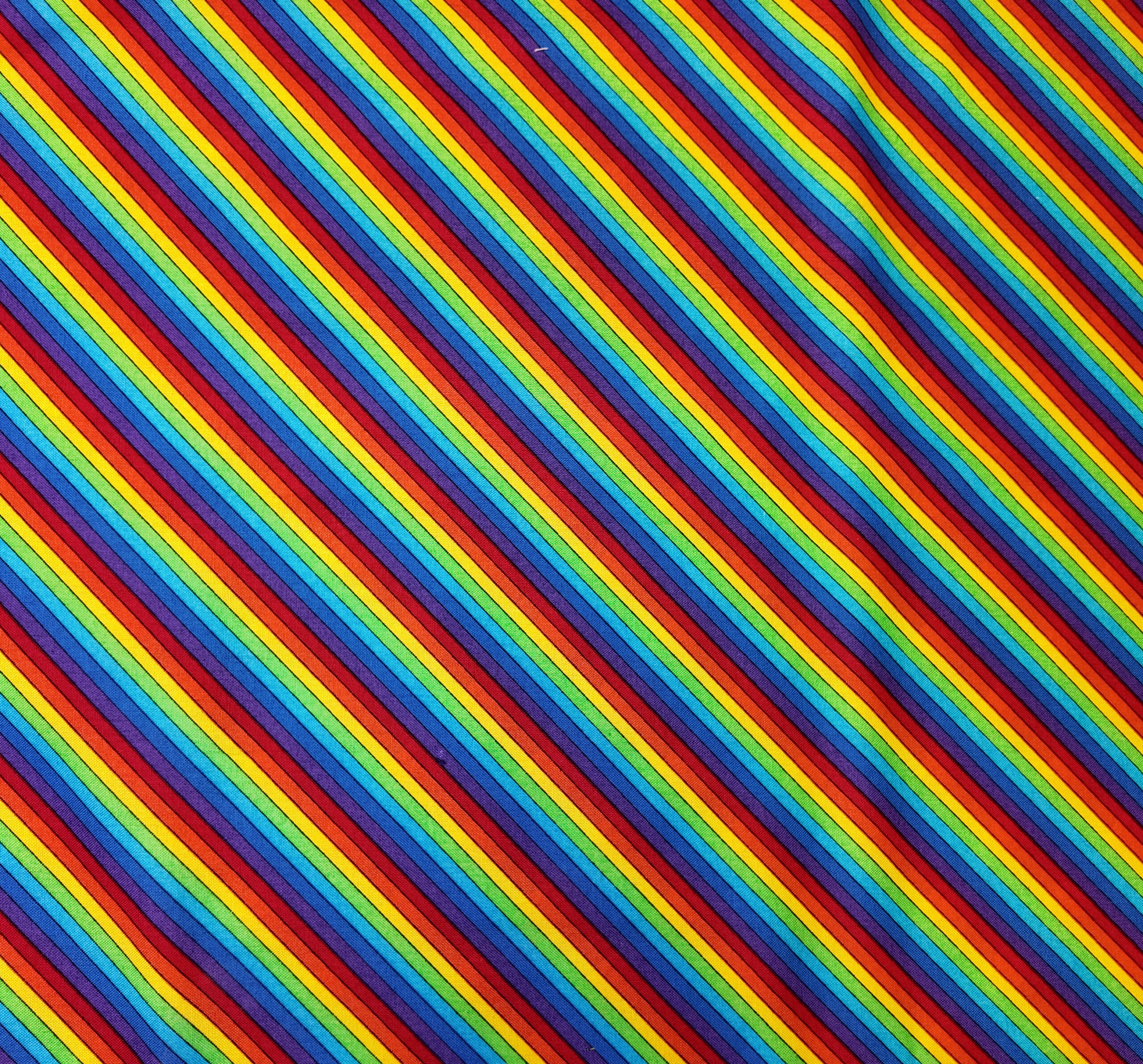 Des rayures diagonales aux couleurs de l’arc-en-ciel déploient leur éclat lumineux. Un tissu vibrant, symbole de gaieté et de liberté.