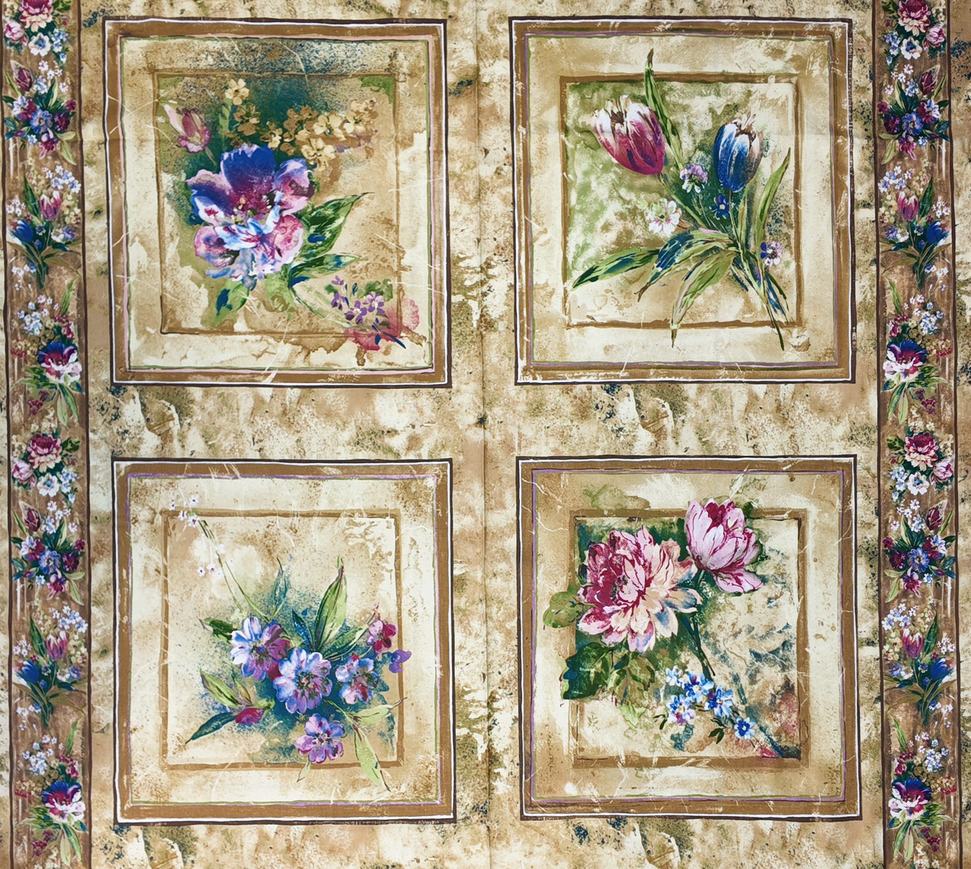 Dans un décor aux reflets sable, quatre tableaux floraux s’épanouissent comme des fenêtres anciennes ouvertes sur un jardin doré. Les teintes chaudes entourent des bouquets peints à la main, mêlant violets doux, roses profonds et verts lumineux. Une impression d’élégance intemporelle se déploie dans chaque carré.